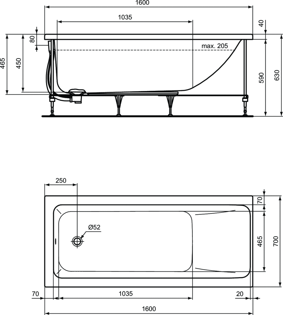 Wanna wykonana z wysokiej jakości akrylu sanitarnego o grubości 4 mm. Bez otworu na baterię. Otwór na syfon Ø52 mm. W komplecie nogi do wanny i zestaw odpływowo-przelewowy (do zamówienia osobno - T00077001 oraz TT6105969). Z panelem bocznym oraz przednim. Pojemność 205 l. Niezbędne wyposażenie: - Łącznik syfonu wanny - do przyłącza kanalizacji T00077001. Rura rozszerzająca z Ø40 do Ø50 TT6105969.