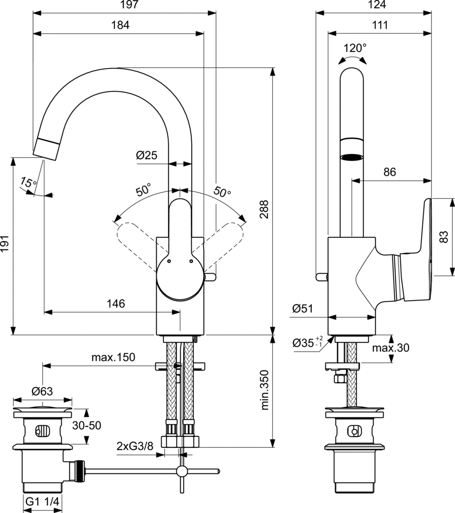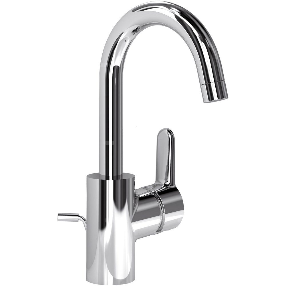 Bateria umywalkowa, paraboliczna wylewka z korkiem automatycznym. Głowica 40 mm CLICK z funkcją ECO i ograniczeniem temperatury wody. Wężyki przyłączeniowe typu SPX G3/8". Paraboliczna wylewka R145 mm 120˚. Areator typu Cascade M24x1. Metalowy uchwyt z nadrukowanymi czerwonymi i niebieskimi oznaczeniami. Metalowy korek automatyczny. System montażu EASY-FIX.