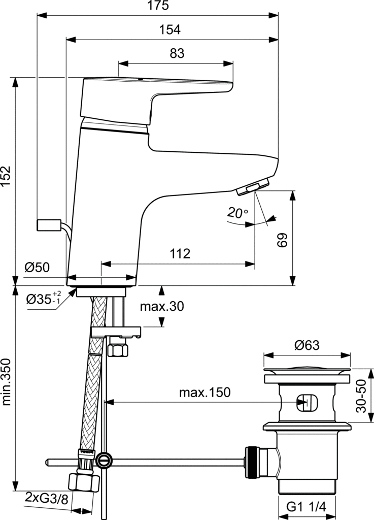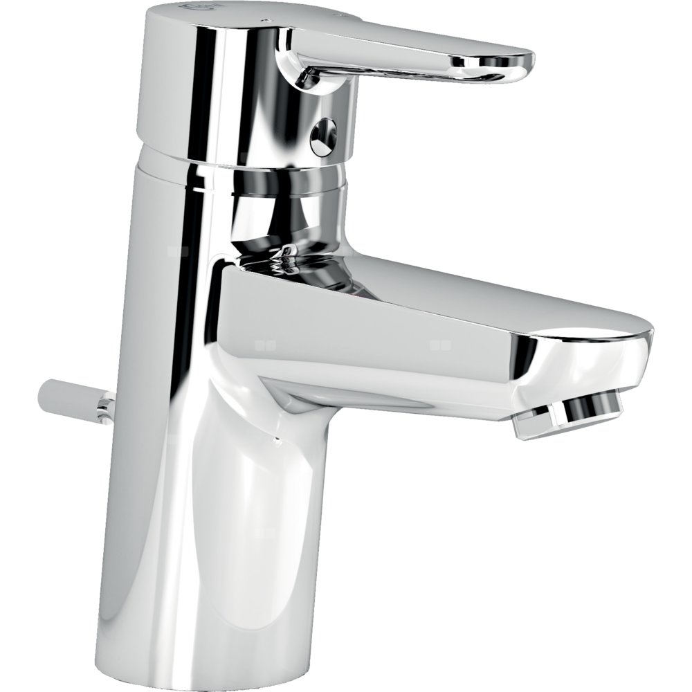 Bateria umywalkowa jednootworowa Connect Blue. Głowica 40 mm CLICK z funkcją ECO i ograniczeniem temperatury wody. Wężyki przyłączeniowe typu PEX G3/8". Areator typu Cascade M24x1. Metalowy uchwyt z nadrukowanymi czerwonymi i niebieskimi oznaczeniami. System montażu EASY-FIX. Metalowy pierścień. Metalowy korek automatyczny.