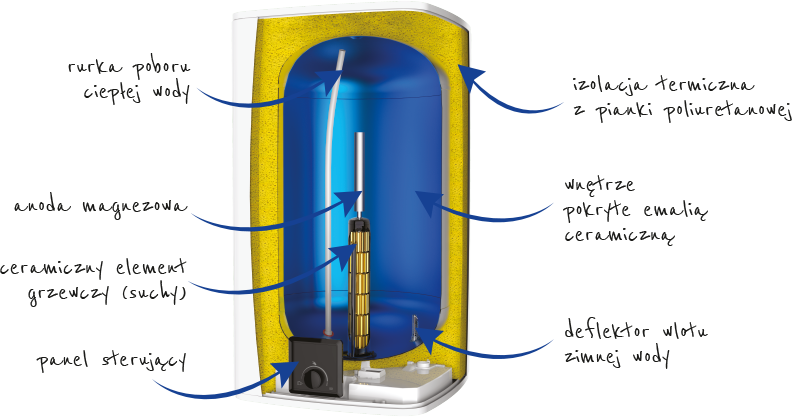 Łatwy i szybki w instalacji, bardzo ekonomiczny w ekspolatacji, krótki czas nagrzewania wody, zabezpiecznie przed uruchomieniem pracy na sucho, ceramiczny, suchy element grzewczy (moc punktowa 4 W/cm2) przeznaczony do każdego rodzaju wody, izolacja wykonana z wysokogatunkowej pianki poliuretanowej (0% C.F.C., gęstość 35-40 g/l), bezwarunkowa gwarancja na płaszcz bez wymogu wymiany anody, elektroniczny, intuicyjny panel sterowania, pokrętło regulacji temperatury w zakresie 50-70˚C, tryb absence, ograniczający podgrzewanie wody do temp. 7˚C podczas dłuższej nieobecności użytkowników (np. wakacje), wizualna informacja na temat dostępnej ilości ciepłej wody, materiał – stal wysokogatunkowa, kolor biały (RAL 9016), uchwyt mocujący urządzenie do ściany, przewód elektryczny zakończony wtyczką Euro, zawór bezpieczeństwa, mufka dielektryczna, zasilanie ~230 V/50 Hz