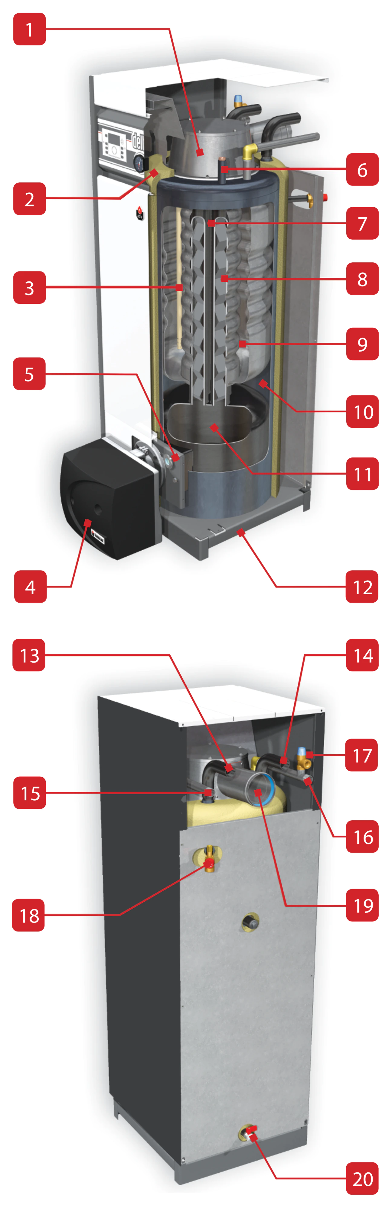 - Stojący kocioł dwufunkcyjny z wbudowanym zasobnikiem ciepłej wody ze stali nierdzewnej