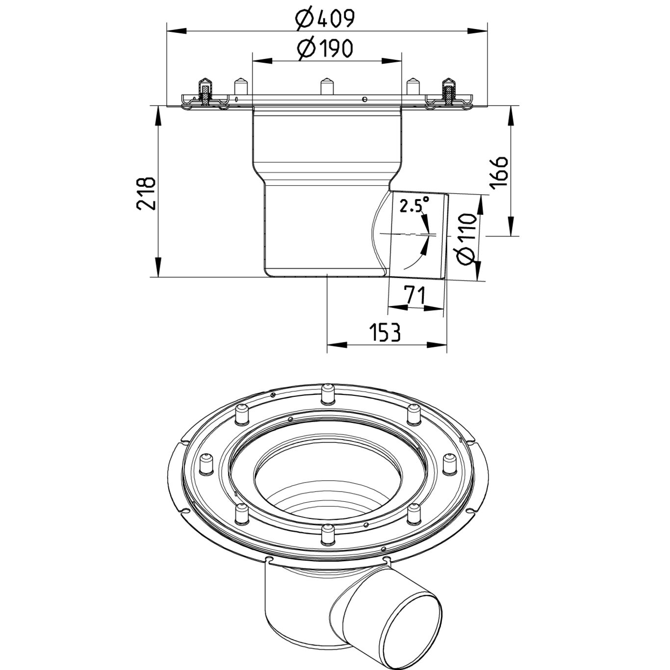 Dolna część do kanałów, odpływ poziom z redukcją 160/110, z kołnierzem do izolacji suchej