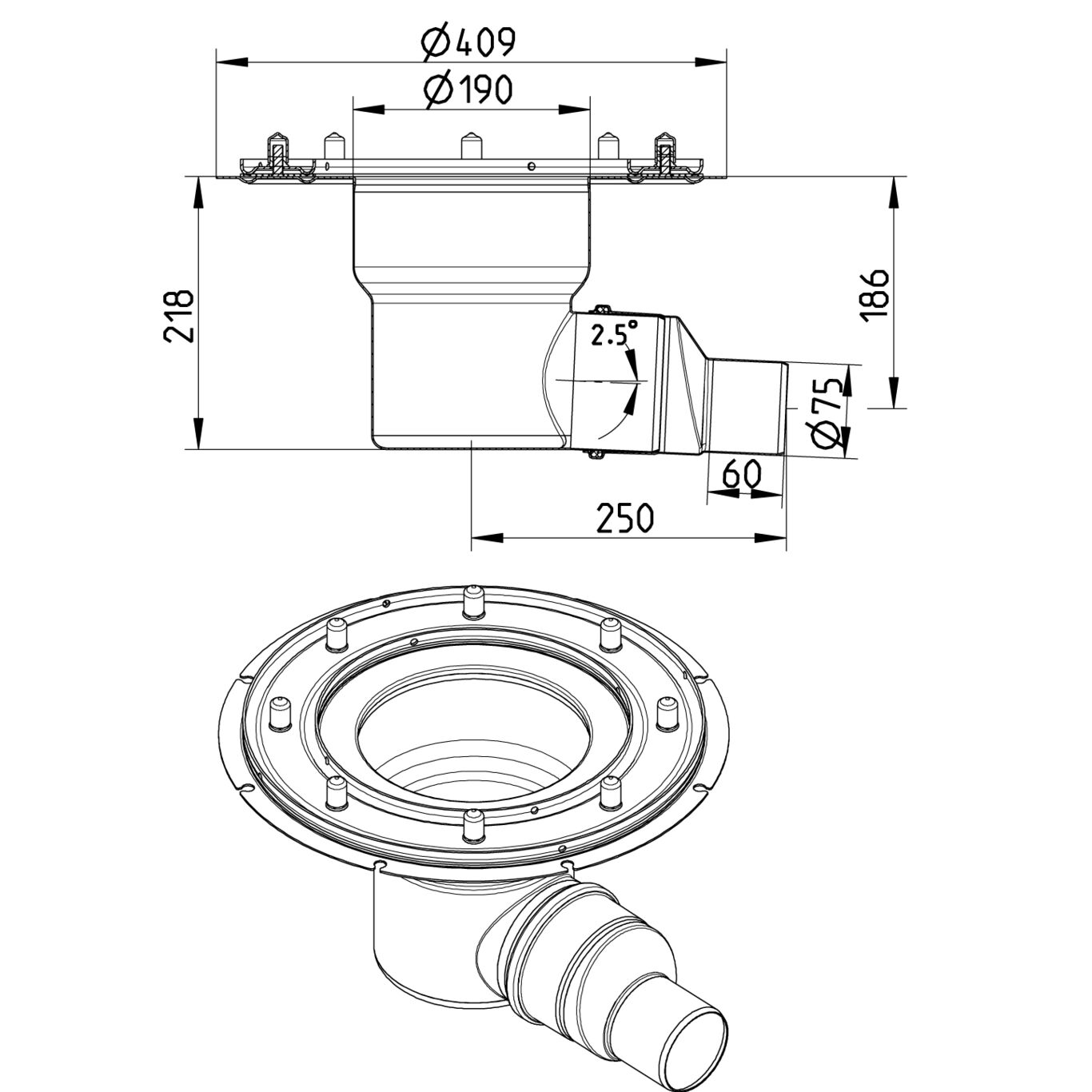 Dolna część do kanałów, odpływ poziom z redukcją 160/75, z kołnierzem do izolacji suchej