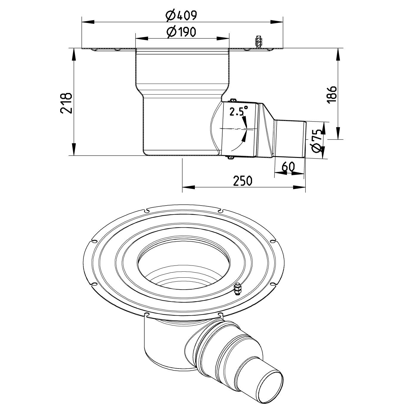 Dolna część do kanałów, odpływ poziom z redukcją 160/75, z kołnierzem do izolacji wylewanej