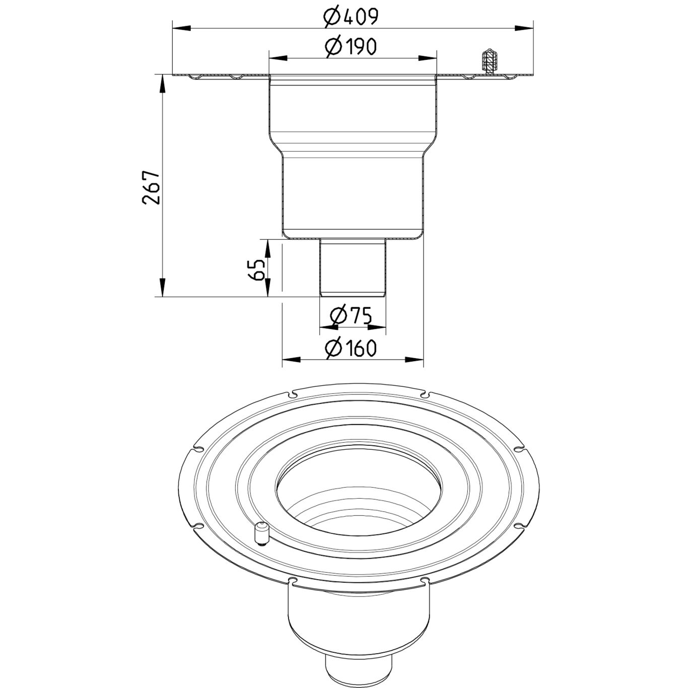 Dolna część wpustu 200, odpływ pion DN =75-V, z kołnierzem, do podłóg z izolacją