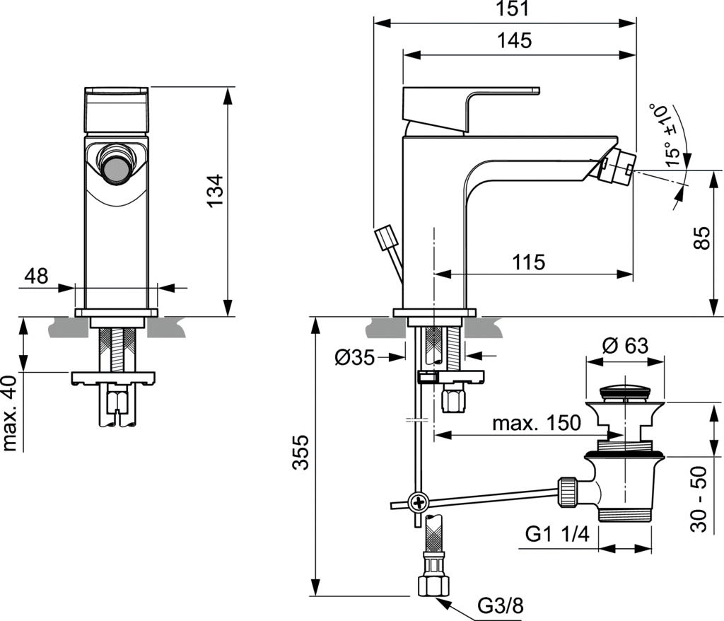 Bateria bidetowa z metalowym korkiem automatycznym. Głowica ceramiczna IS 28 mm. Smukły, mosiężny, odlewany korpus. Metalowy uchwyt z logo Ideal Standard oraz nadrukowanymi czerwonymi i niebieskimi oznaczeniami. Perlator M18x1 - z ogranicznikiem przepływu wody do 5l/min. Metalowy pierścień uszczelniający. Klasa akustyczna 1. Wężyki przyłączeniowe PEX G3/8". System montażu EASY-FIX. Zgodna z EN817.