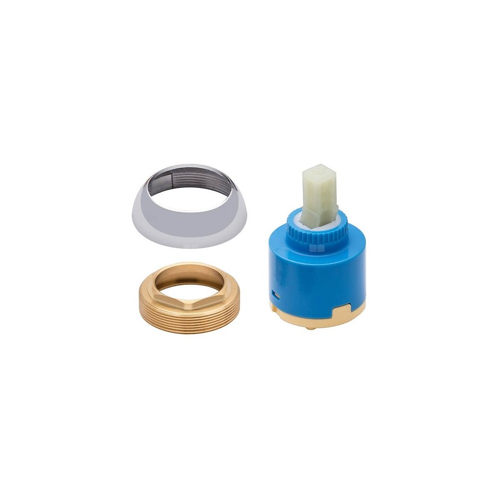 Głowica baterii Avedo z pierścieniem jest wykonana z wysokiej jakości płytek ceramicznych. Jej średnica to 40 mm. W skład zestawu wchodzi również mosiężna nakrętka dociskowa oraz chromowana maskownica.