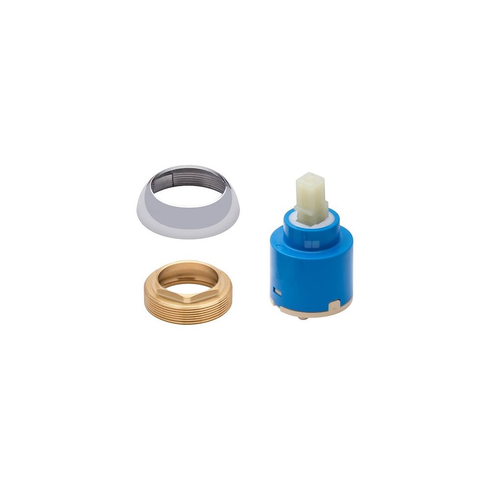 Głowica baterii Cari z pierścieniem jest wykonana z wysokiej jakości płytek ceramicznych. Jej średnica to 40 mm. W skład zestawu wchodzi również mosiężna nakrętka dociskowa oraz chromowana maskownica.