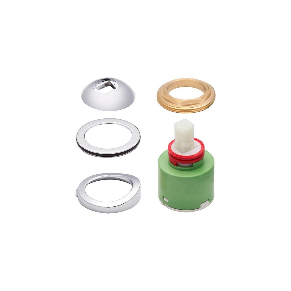 Głowica baterii Mayo z pierścieniem jest wykonana z wysokiej jakości płytek ceramicznych. Została wyposażona w mechanizm zapobiegający poparzeniu Cersanit Thermo Block, oraz dwustopniowey mechanizm otwierania przepływu wody. Jej średnica to 40 mm. W skład zestawu wchodzi również mosiężna nakrętka dociskowa oraz chromowana maskownica.