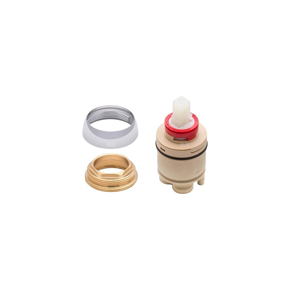 Głowica baterii umywalkowej Vigo z pierścieniem jest wykonana z wysokiej jakości płytek ceramicznych. Została wyposażona w mechanizm zapobiegający poparzeniu Cersanit Thermo Block, oraz dwustopniowey mechanizm otwierania przepływu wody. Jej średnica to 35 mm. W skład zestawu wchodzi również mosiężna nakrętka dociskowa oraz chromowana maskownica