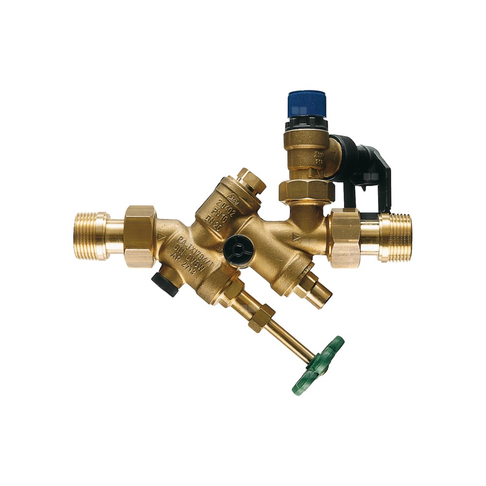 Grupa bezpieczeństwa do zasobników stojących CWU, do 1000L z podłączeniem zaworu ograniczającego ciśnienie, obudowa mosiężna z króćcem G3/4