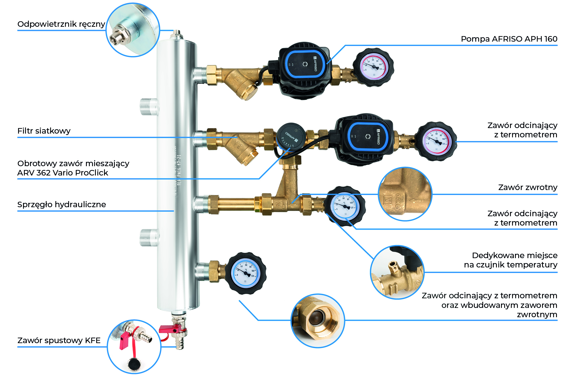 Pozwala na przyłączenie dwóch obiegów grzewczych/chłodzących.