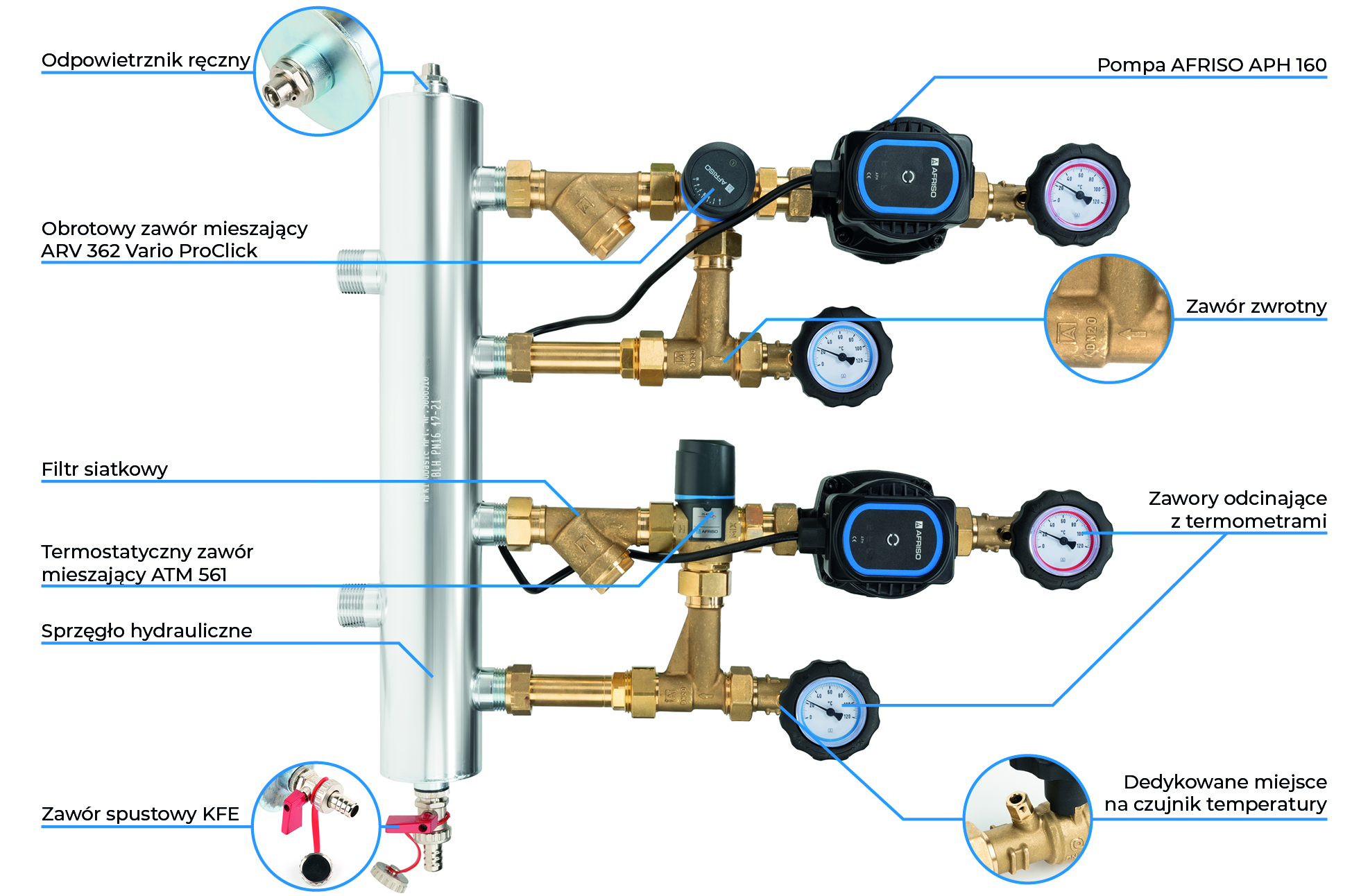 Pozwala na przyłączenie dwóch obiegów grzewczych/chłodzących.