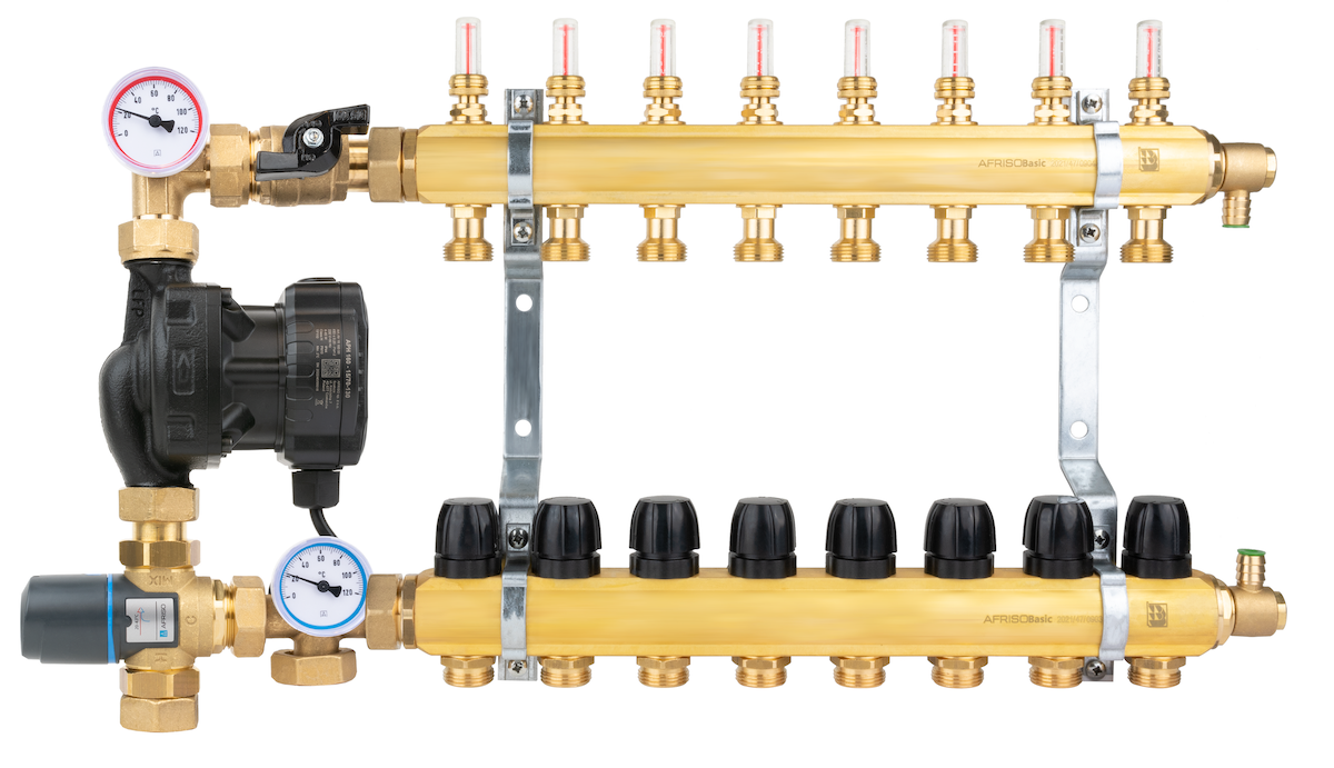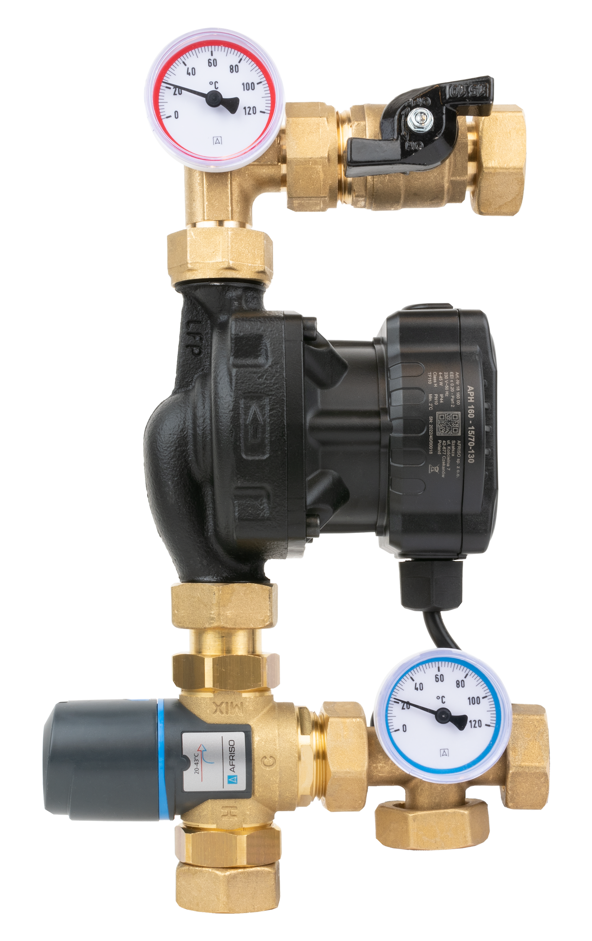 Grupa pompowa AFRISO BTU 501 AP nakrętka x nakrętka 1'' x 1'', z zaworem termostatycznym, z pompą obiegową AFRISO APH 160 15-7/130 mm
