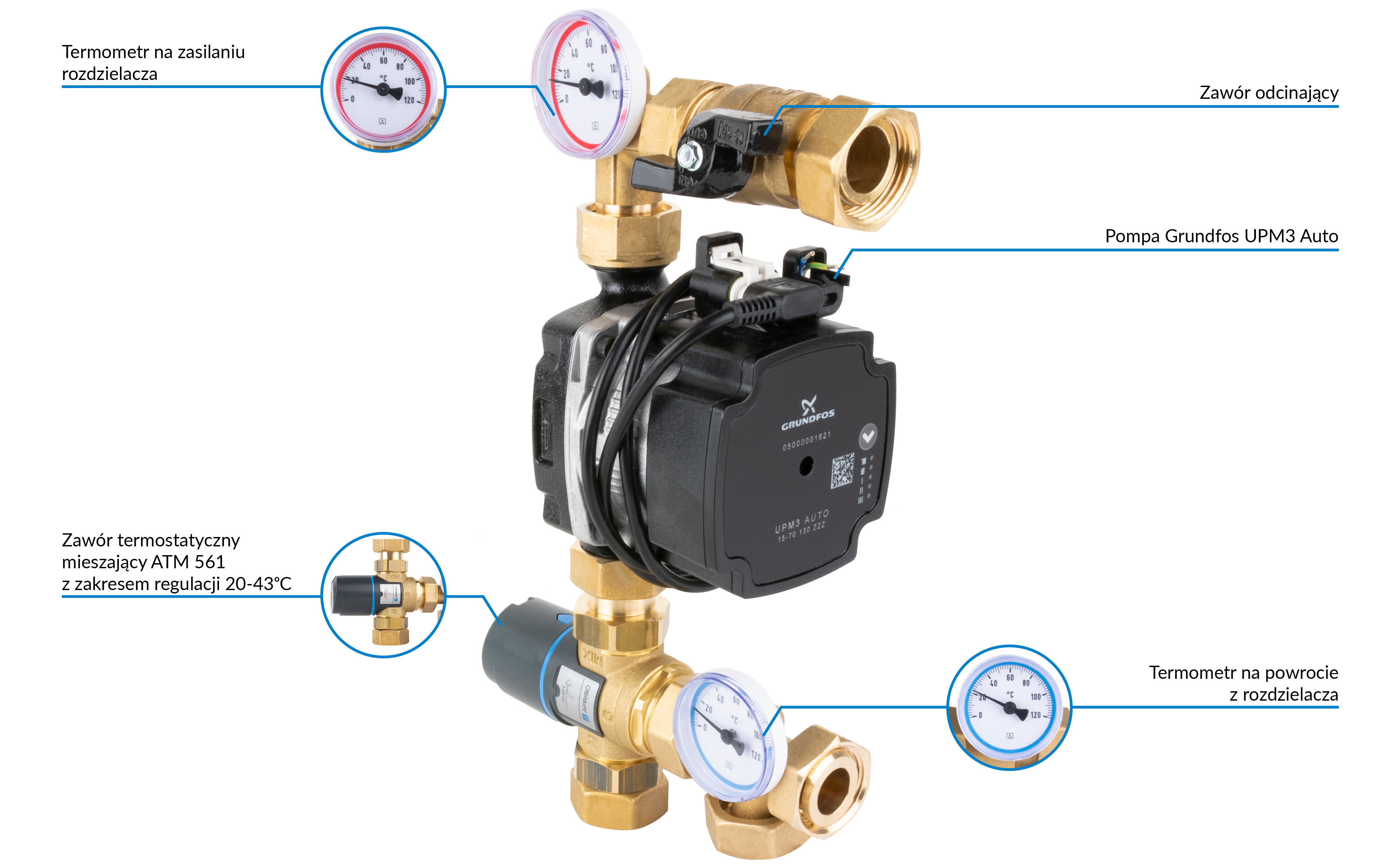Stosowany w instalacjach grzewczych.Montowany między źródłem ciepła a rozdzielaczem ogrzewania płaszczyznowego w szafce rozdzielacza.
