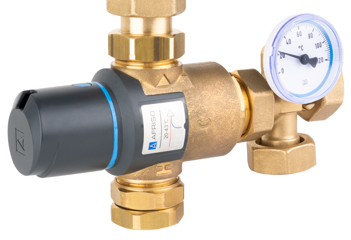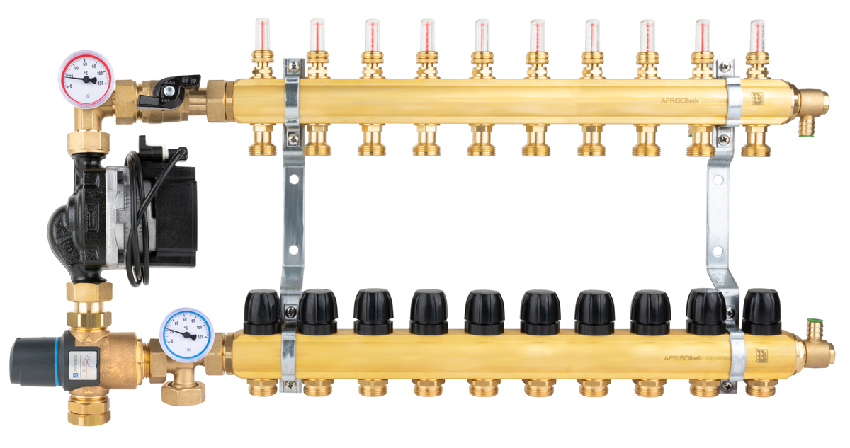 Grupa pompowa AFRISO BTU 502 nakrętka x nakrętka 1'' x 1'', z zaworem mieszającym, z pompą obiegową Grunfos UPM3 Auto
