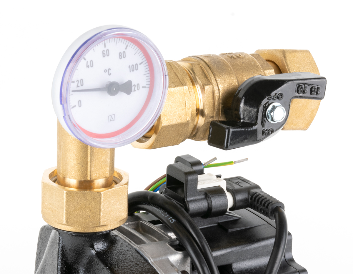 Zawór odcinający umożliwia odcięcie pompy obiegowej od belki zasilającej rozdzielacza.