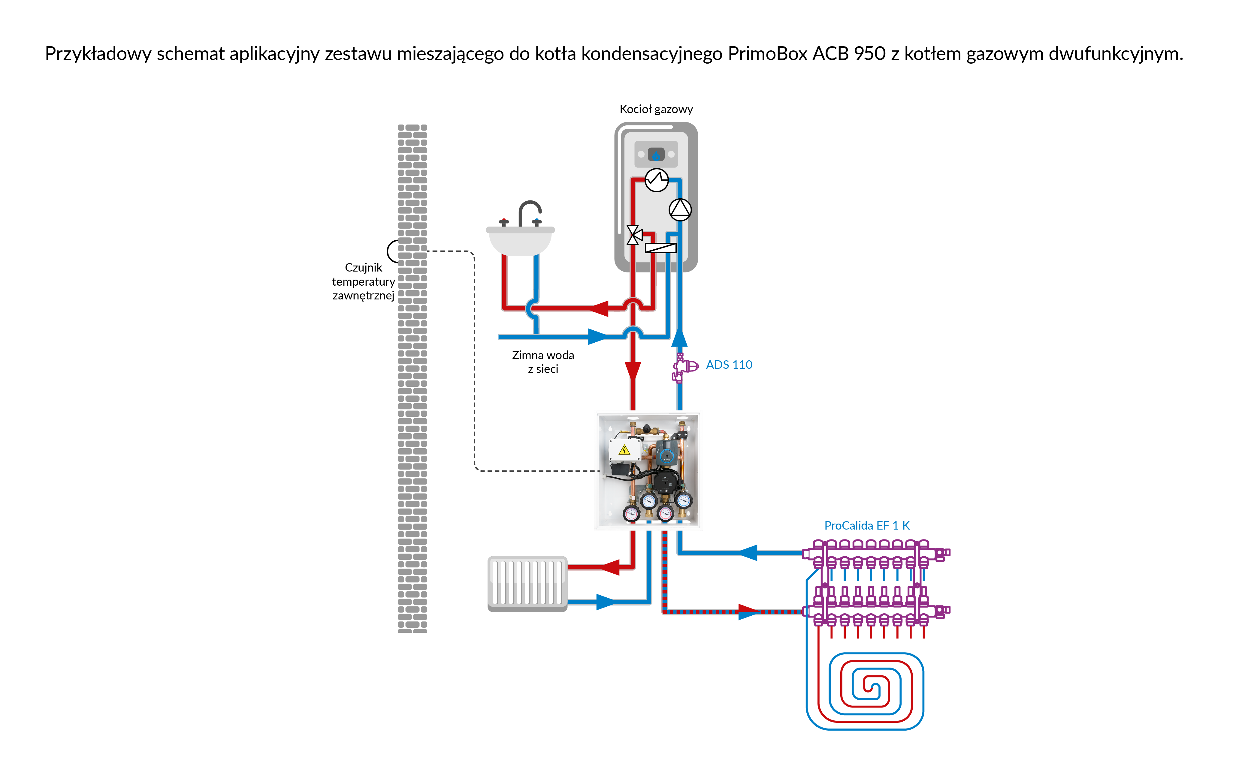 Tworzy dwie strefy ogrzewania o różnych temperaturach zasilania.