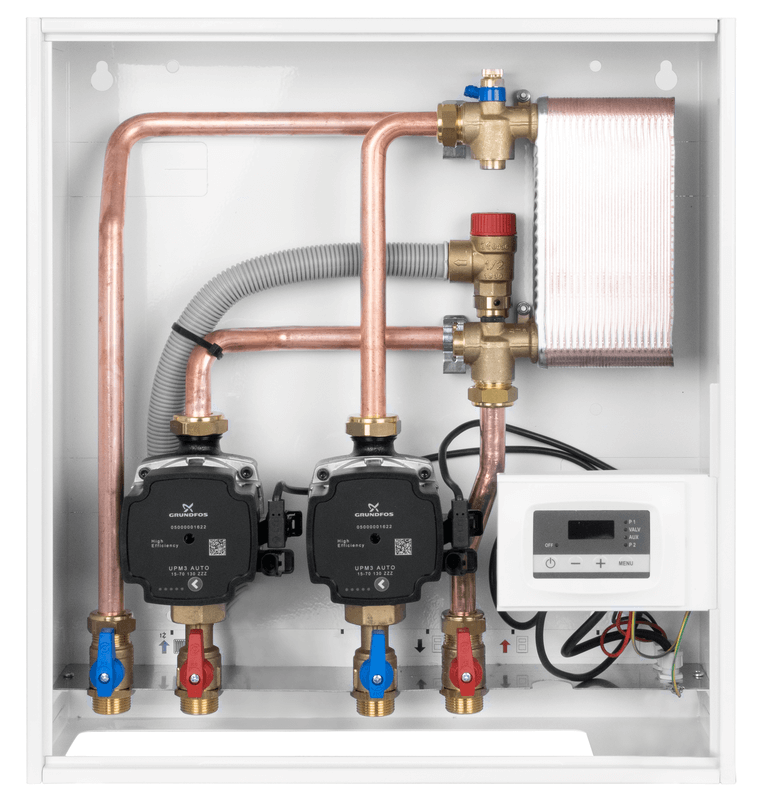 Stosowany do połączenia dwóch różnych źródeł ciepła poprzez oddzielanie ich obiegów za pomocą wymiennika płytowego.Montowany na lub w ścianie w pobliżu źródła ciepła.