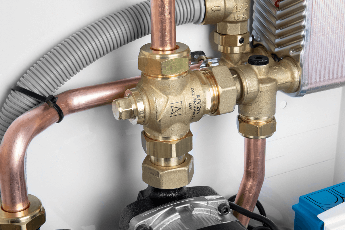 Posiada wbudowany zawór temperaturowy *ATV* 213 do ochrony źródła ciepła na paliwo stałe przed zbyt niską temperaturą powrotu.