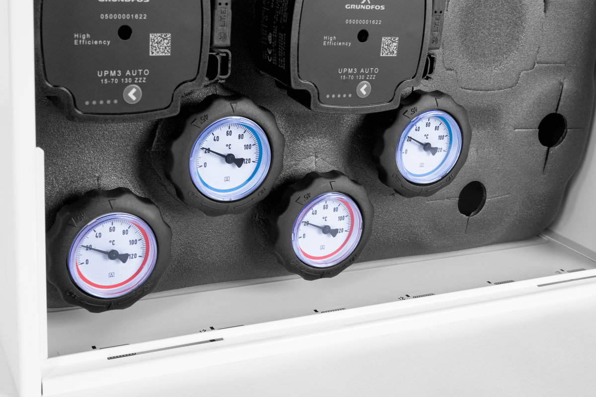 - Wyposażony w pompy Grundfos UPM3 i obrotowy zawór mieszający z siłownikiem ARM 141 ProClick.
