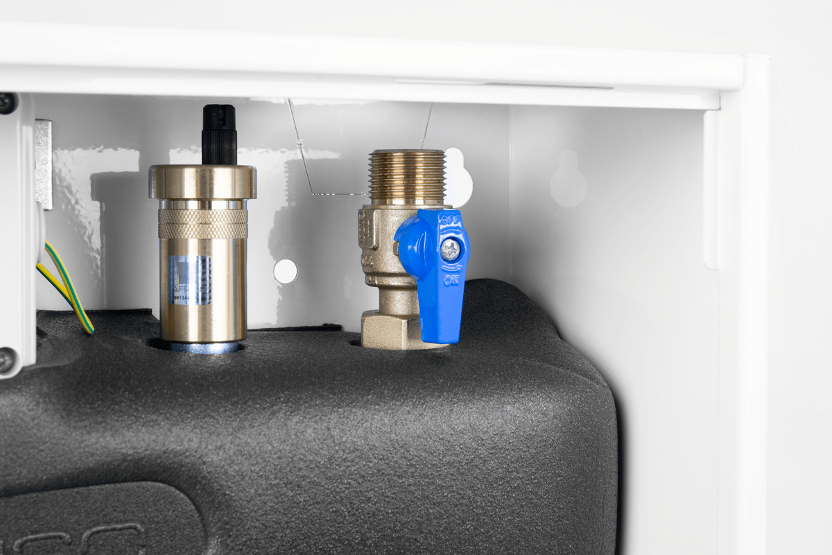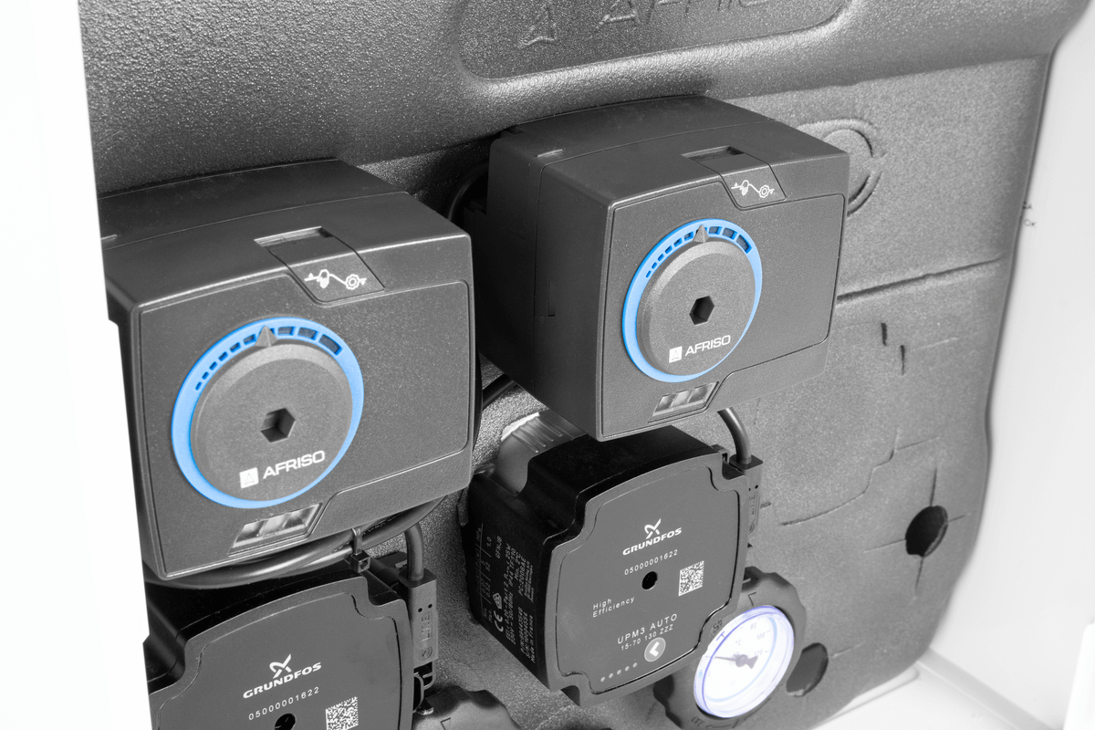 Wyposażony w pompy Grundfos UPm³ i zawory obrotowe z siłownikami elektrycznymi ARM 141.