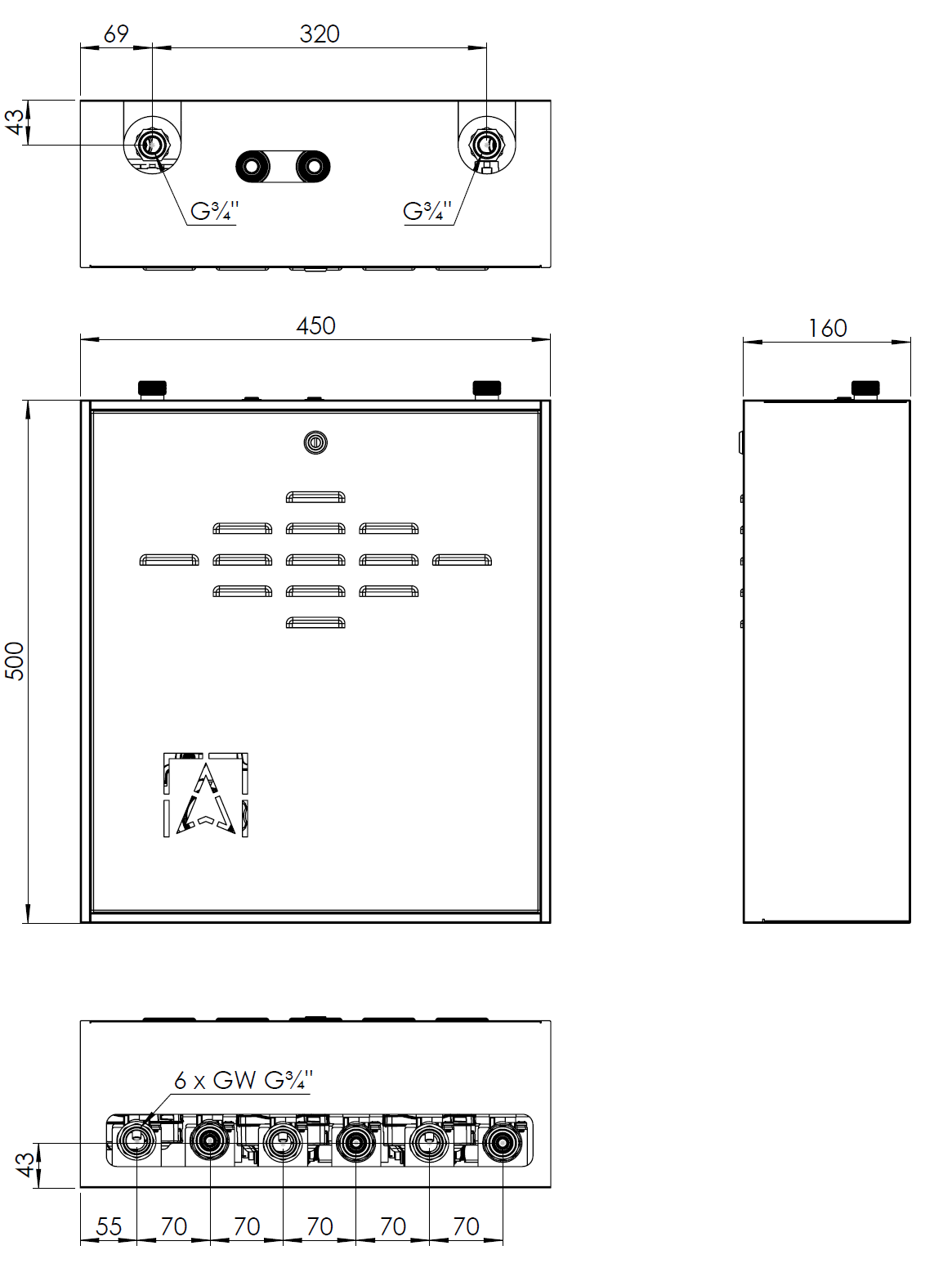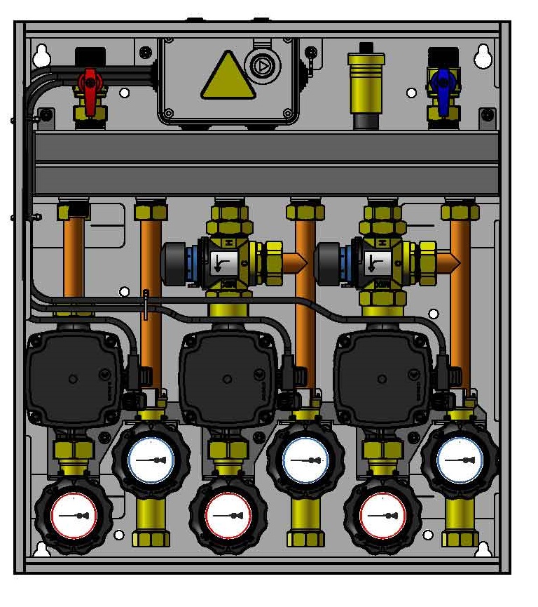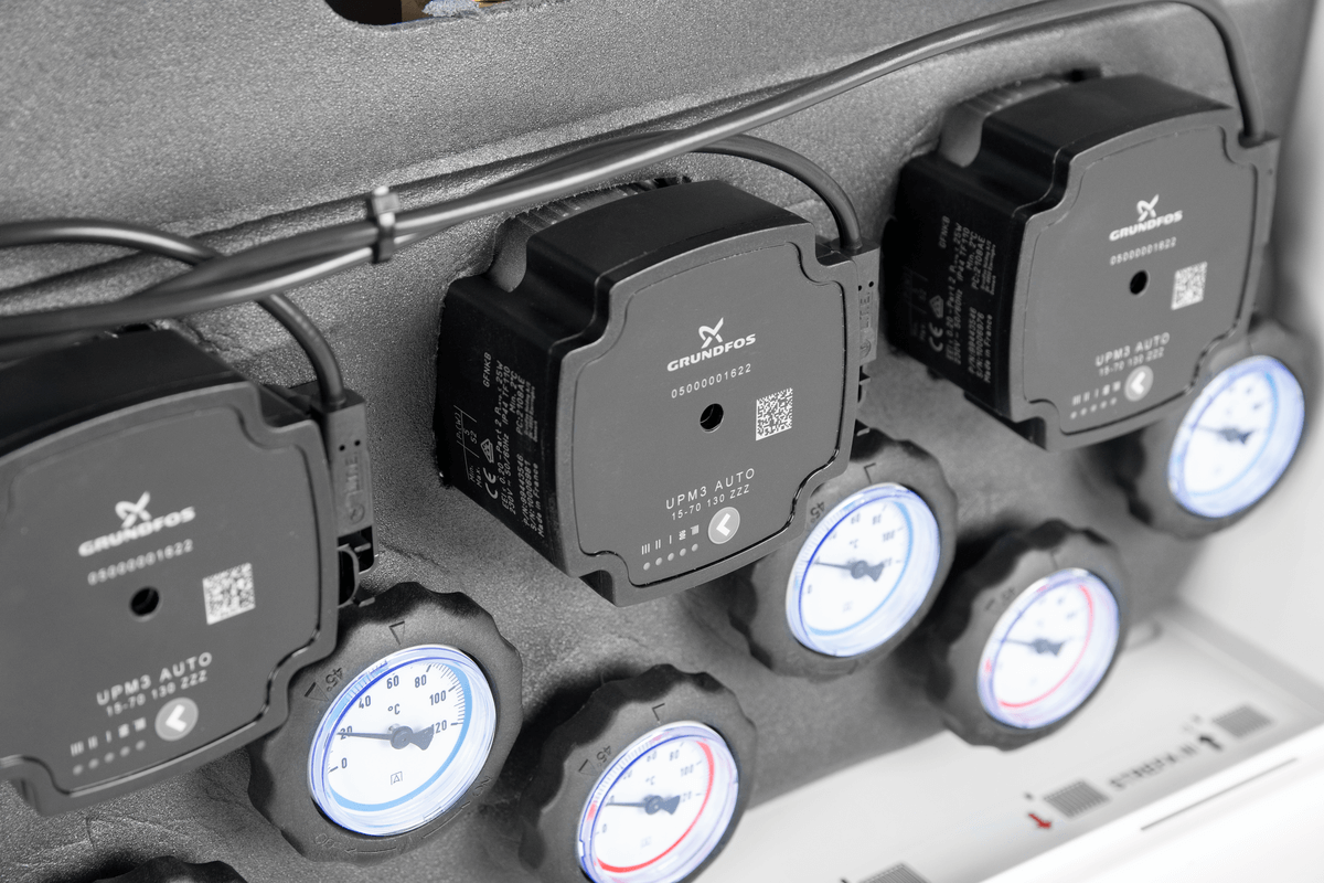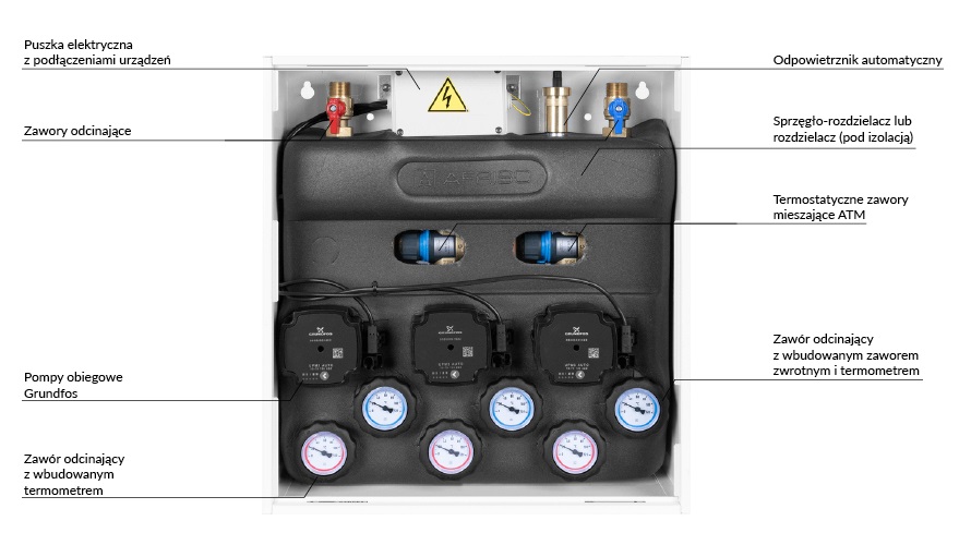 Wyposażony w pompy Grundfos UPm³ i termostatyczne zawory mieszające ATM 561 z regulacją 20 ÷ 43°C. Zakres dobrany na podstawie optymalnych temperatur zasilania instalacji ogrzewania podłogowego.
