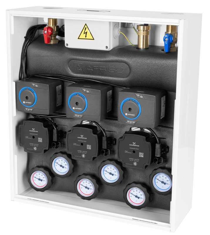Wyposażony w pompy Grundfos UPm³ oraz zawory obrotowe z siłownikami ARM 141.