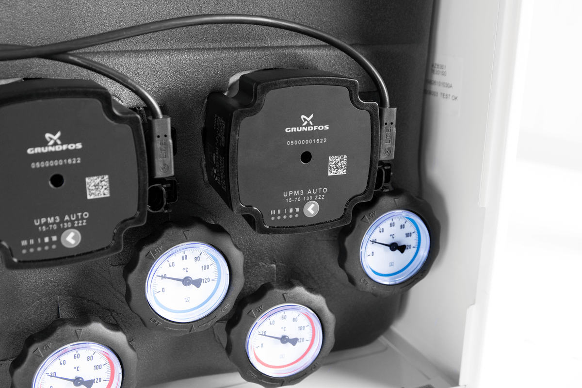 Wyposażony w pompy Grundfos UPm³ oraz zawory obrotowe z siłownikami ARM 141.