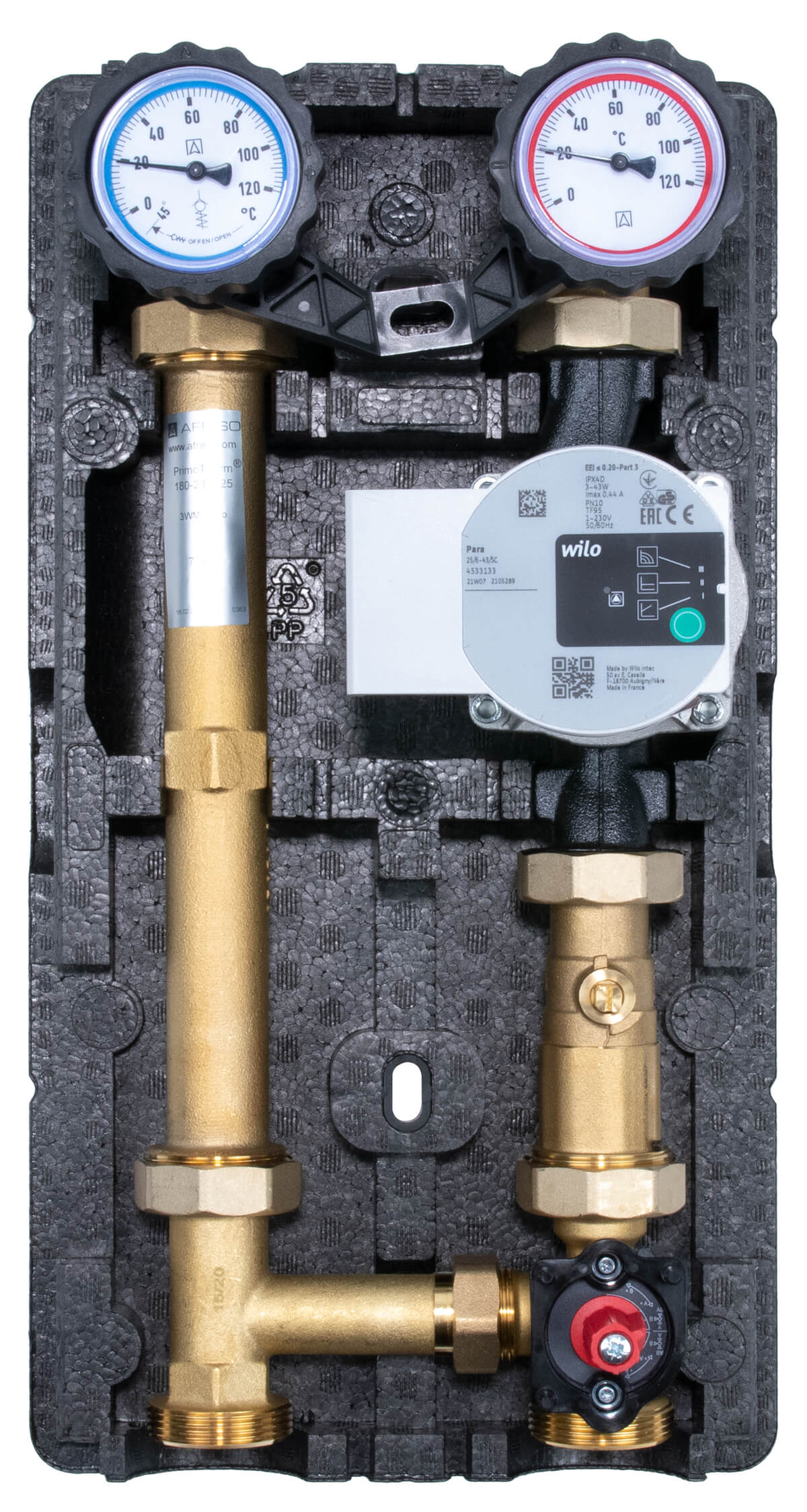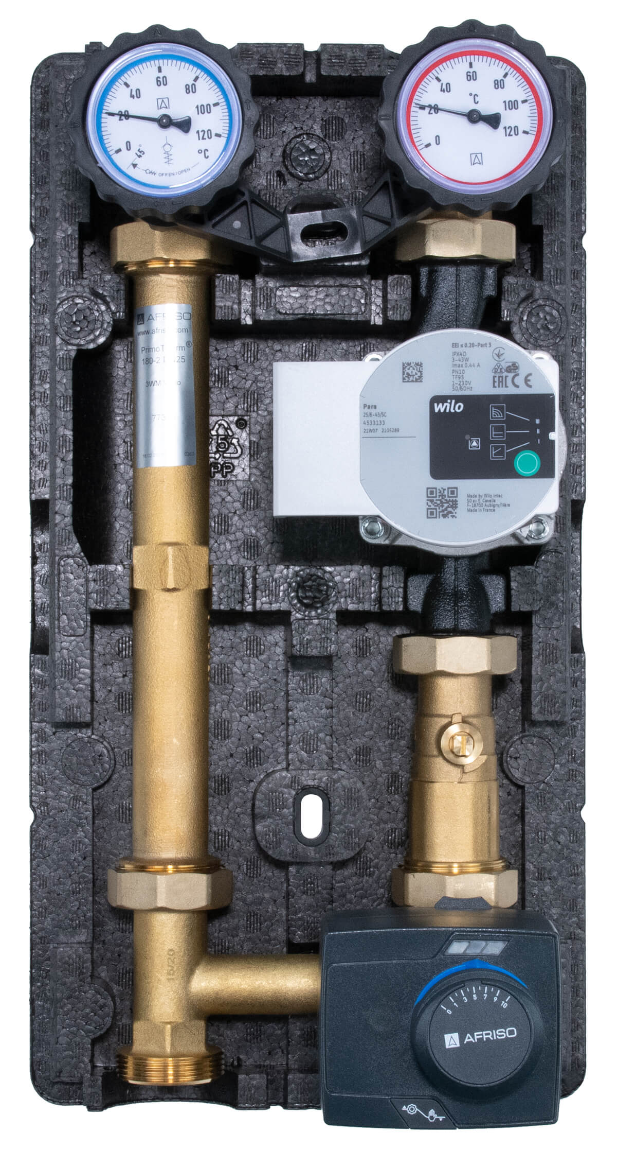 Grupa pompowa AFRISO PrimoTherm 180-2 DN 25 WP 3-WM-SM Vario GZ x GW 1 1/2'' x 1'', z zaworem mieszającym, z izolacją, z pompą obiegową Wilo Para SC 25/6, z siłownikiem arm 343 proclick