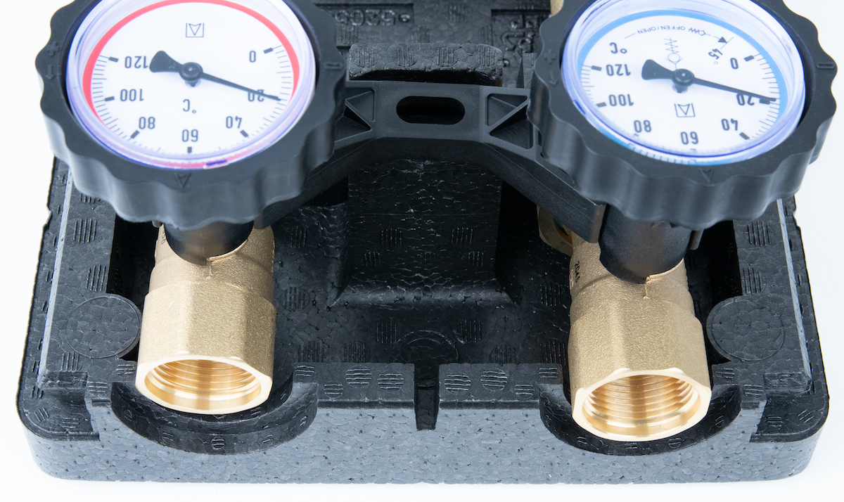 Wyposażona w niezbędne komponenty: termometry, zawór zwrotny, zawory odcinające na zasilaniu i powrocie, zawór odcinający przed pompą i izolację termiczną.