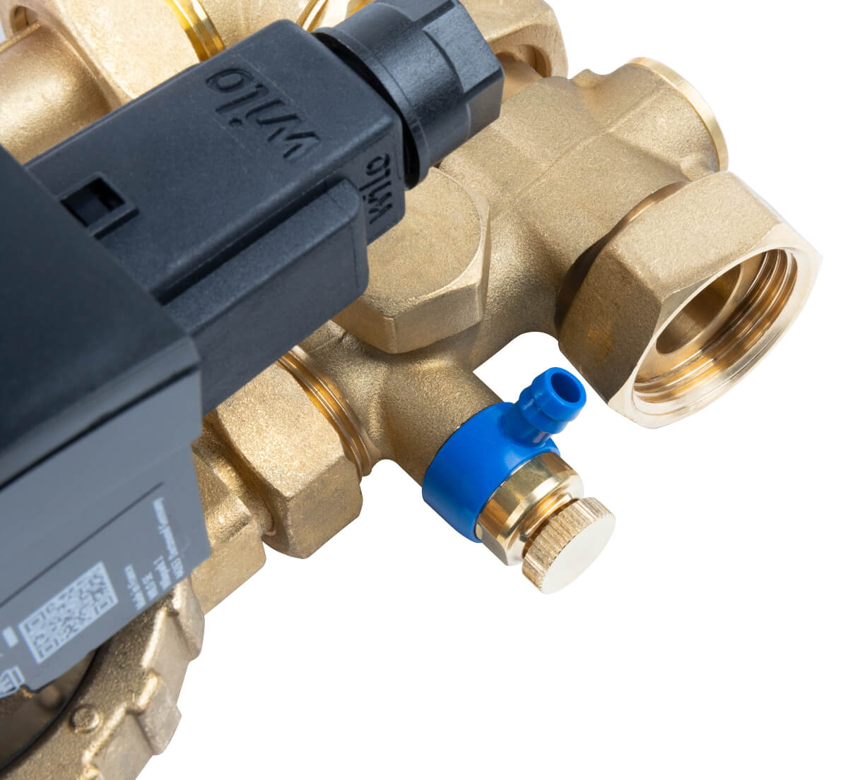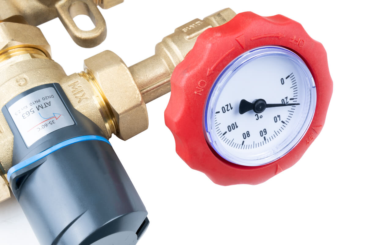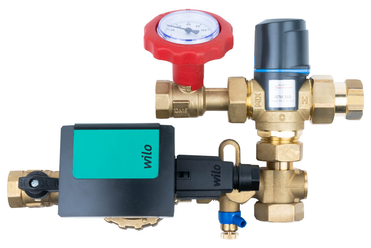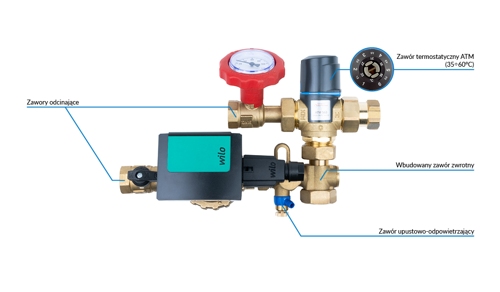 - Zawór termostatyczny ATM zapobiega oparzeniom i pozwala bezpiecznie podnieść temperaturę w zasobniku (np. celem wygrzania lub zwiększenia ilości ciepłej wody).