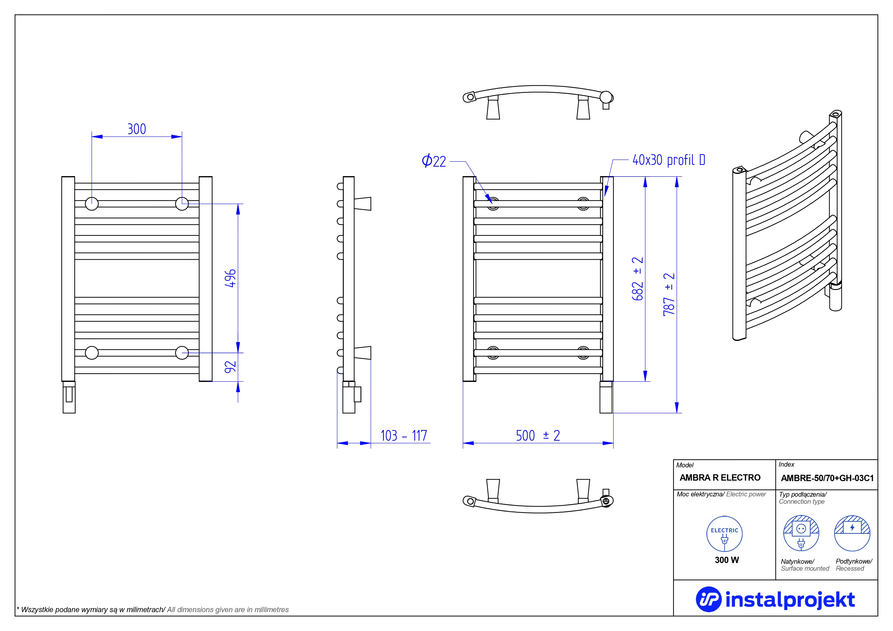 Grzejnik elektryczny (suszarka) INSTAL-PROJEKT AMBRA R ELECTRO, wym. 682 (787 z grzałką)/500 mm, kolor biały połysk, moc 300 W