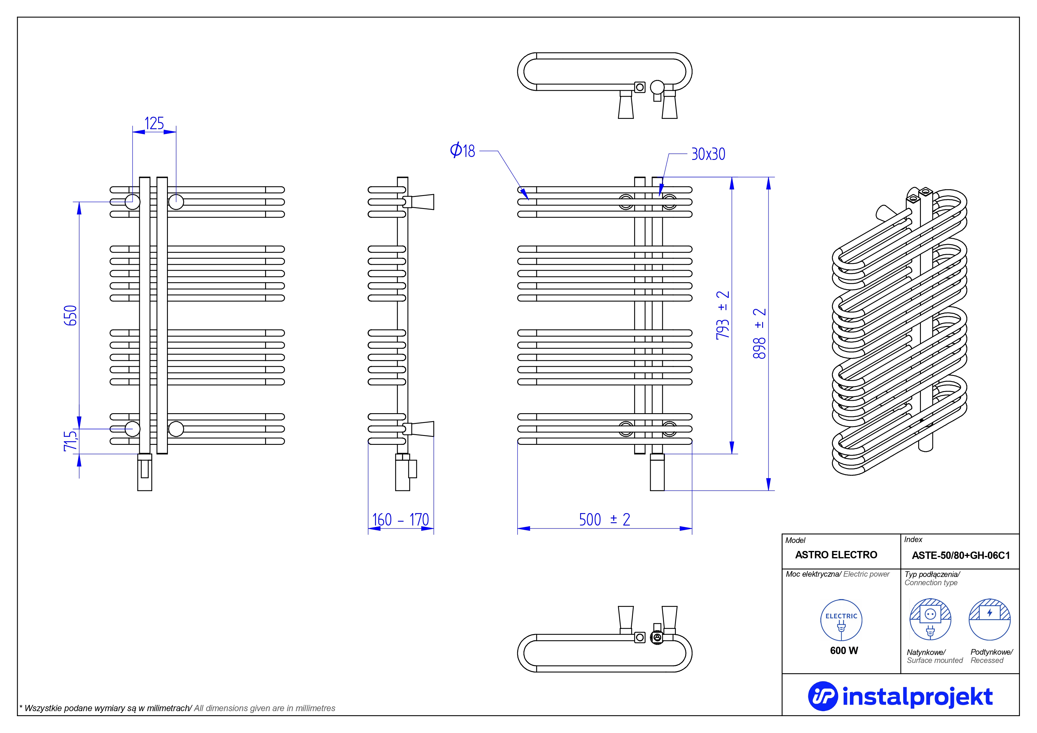 Grzejnik elektryczny (suszarka) INSTAL-PROJEKT ASTRO ELECTRO, wym. 793 (898 z grzałką)/500 mm, kolor biały mat, moc 600 W