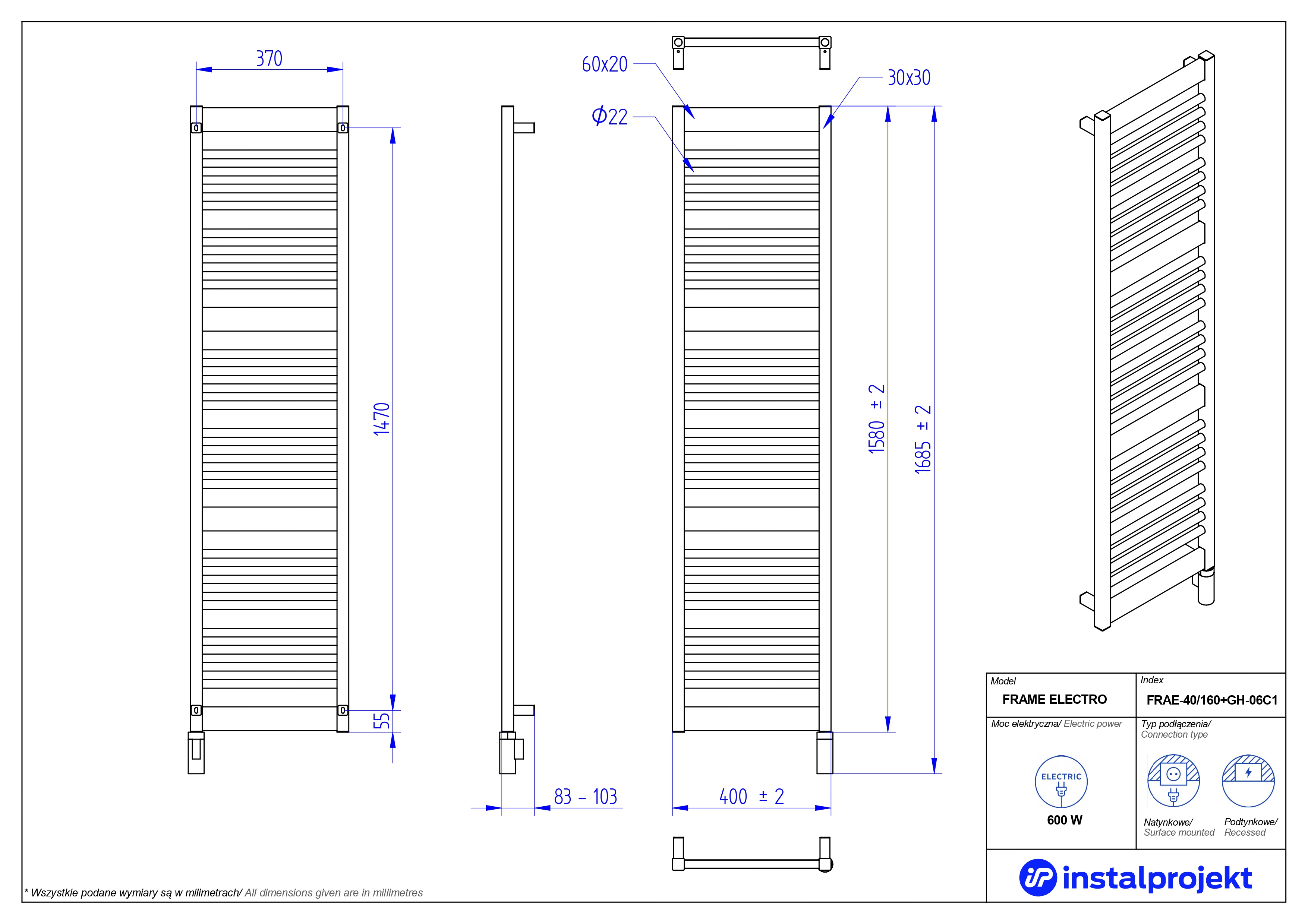 Grzejnik elektryczny (suszarka) INSTAL-PROJEKT FRAME ELECTRO, wym. 1580 (1685 z grzałką)/400 mm, kolor czarny mat, moc 600 W