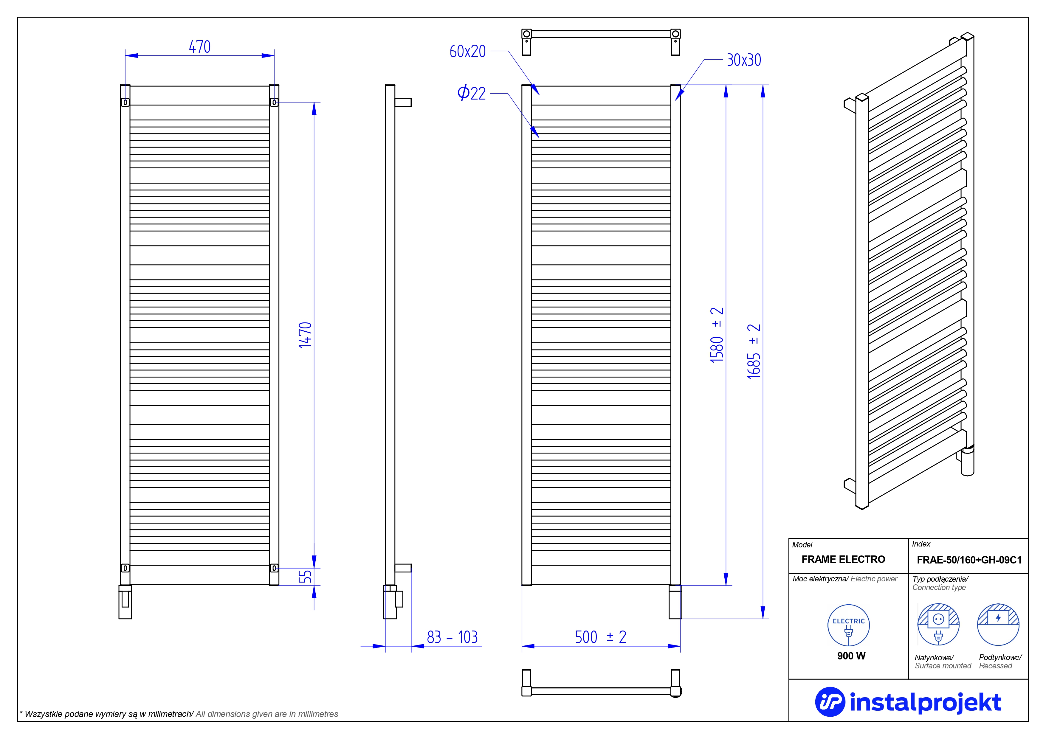 Grzejnik elektryczny (suszarka) INSTAL-PROJEKT FRAME ELECTRO, wym. 1580 (1685 z grzałką)/500 mm, kolor biały mat, moc 900 W