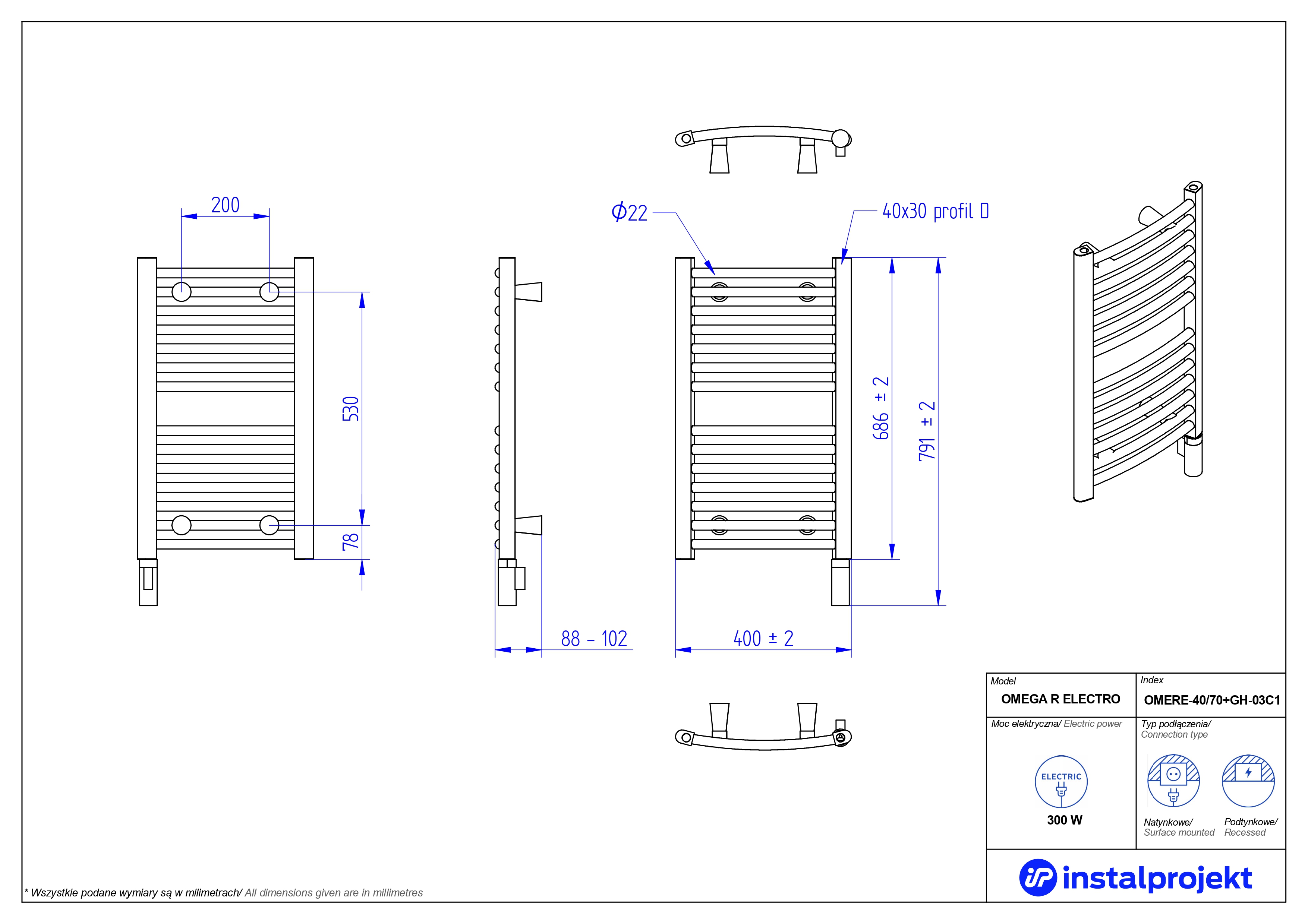 Grzejnik elektryczny (suszarka) INSTAL-PROJEKT OMEGA R ELECTRO, wym. 686 (791 z grzałką)/400 mm, kolor biały połysk, moc 300 W