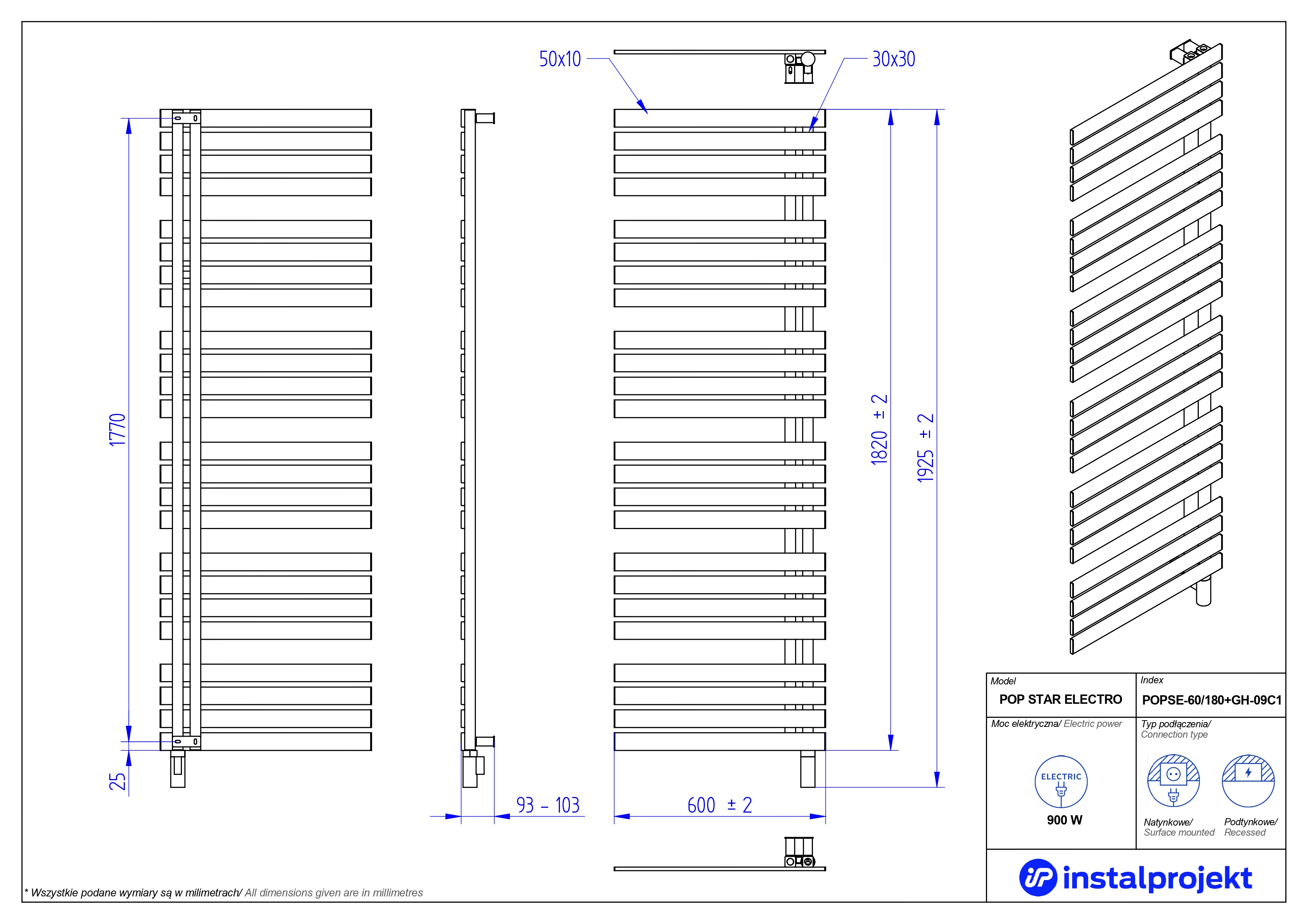 Grzejnik elektryczny (suszarka) INSTAL-PROJEKT POP STAR ELECTRO, wym. 1820 (1925 z grzałką)/600 mm, kolor czarny, moc 900 W