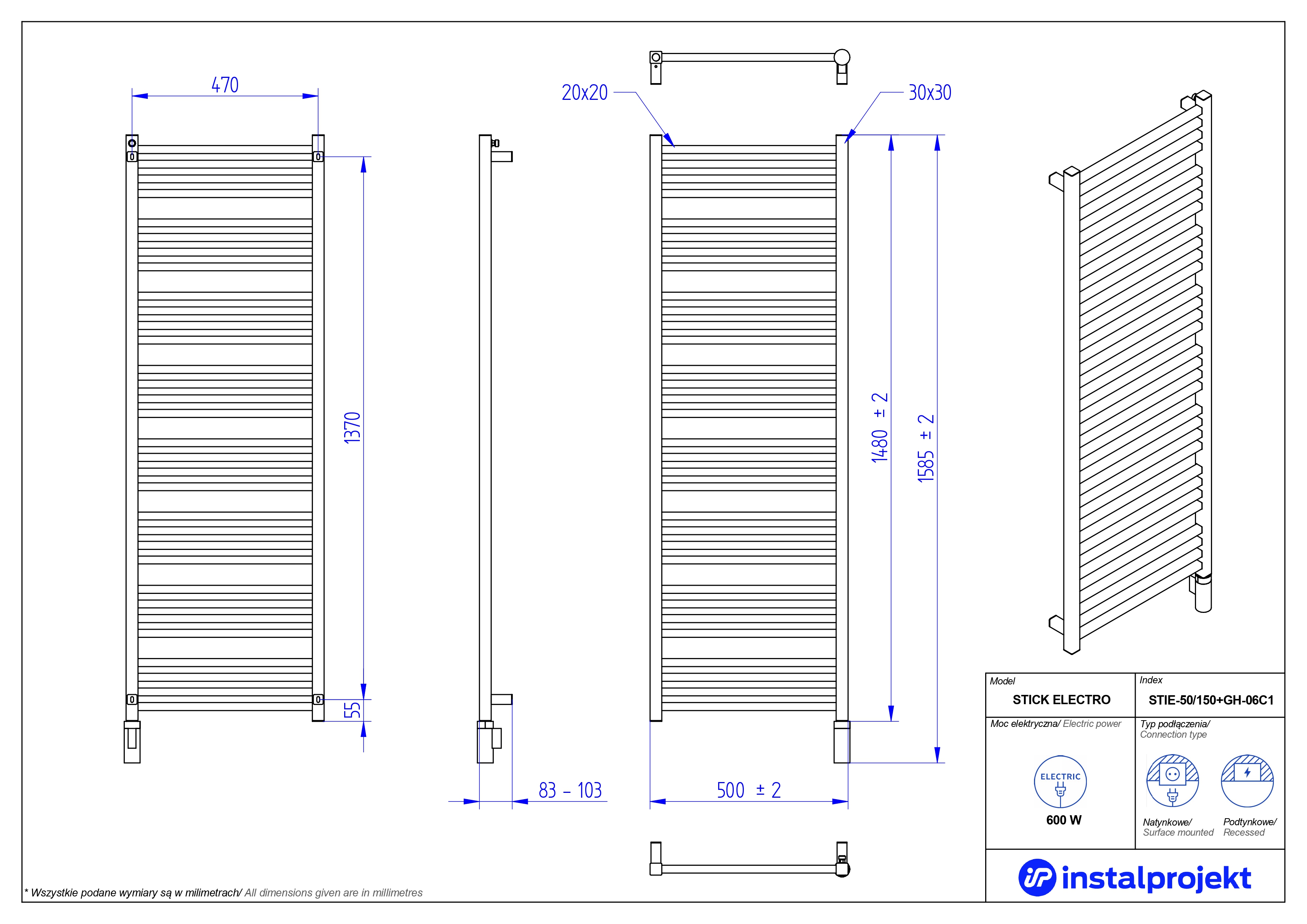 Grzejnik elektryczny (suszarka) INSTAL-PROJEKT STICK ELECTRO, wym. 1480 (1585 z grzałką)/500 mm, kolor biały połysk, moc 600 W