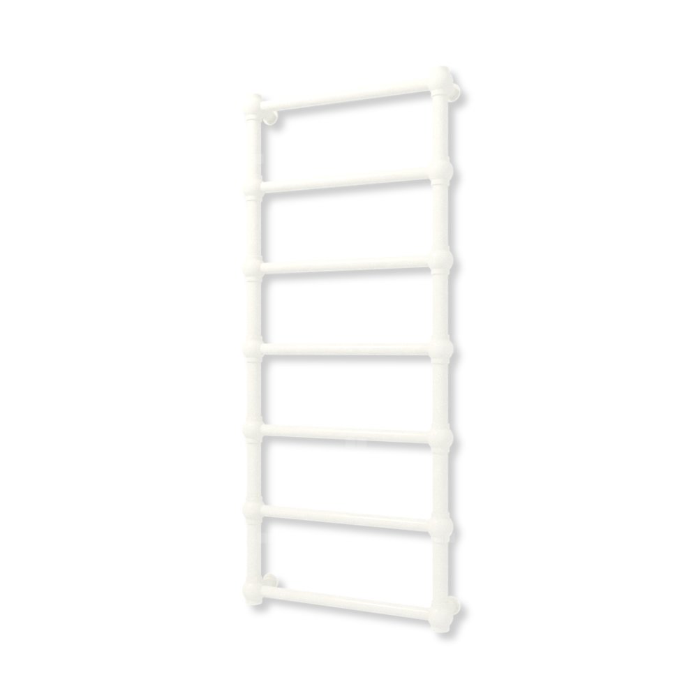 Bryła grzejnika została skonstuowana z rur o przekroju koła oraz stalowych kul. Całość tworzy formę charakterystyczną dla stylu retro.