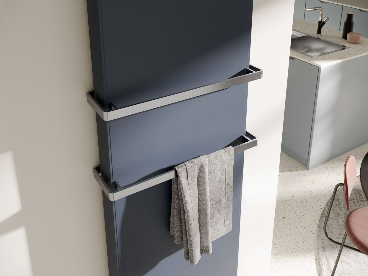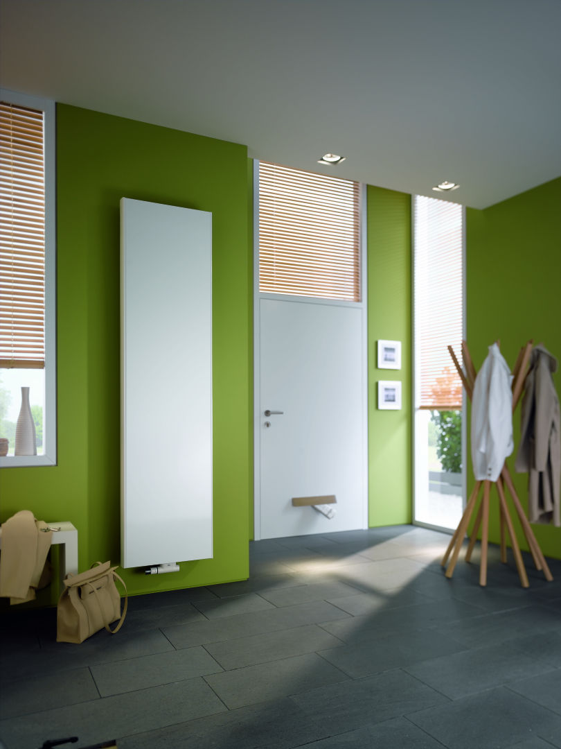 Smukły grzejnik płytowy pionowy gładki Kermi Verteo PLAN PSN, podłączenie dolne, środkowe lub po zewnętrznej, zasilanie z lewej strony, możliwość podłączenia grzejnika od góry, gwint wewn. 6 x 1/2”, obieg wody wymuszony, stalowy, produkowany wg normy PN EN 442, posiada znak CE, deklarację DWU. Wysoka moc grzewcza – odpowiednia do niskich temperatur zasilania, np. pompy ciepła. Dostarczany z: kompletem mocowań do ściany, odpowietrznikiem, kompletem osłon bocznych (górna na zamówienie) wykonanych z blachy ocynkowanej – łatwych do zdjęcia (w celu wyczyszczenia) bez ruszania zawiesi. Standardowo kolor biel Kermi zbliżony do RAL 9016. Za dopłatą możliwość zamówienia grzejnika w kolorze z palety Kermi lub RAL Classic i z dodatkową powłoką antykorozyjną. Lakierowanie dwuwarstwowe. Grzejnik odtłuszczony, fosforanowany, zagruntowany zanurzeniowo ETL i lakierowany proszkowo EPS. Ciśnienie robocze 10 bar, temp. max. 110oC Grzejnik standardowo wyposażony w opatentowany system Therm-x2: szeregowe połączenie płyt grzejnika (najpierw zasilana jest płyta przednia, a następnie tylne płyty), co pozwala skrócić o 25 % czas rozgrzewania pomieszczenia oraz zwiększyć do 100% emisję energii przez promieniowanie. Wszystkie te funkcje, w połączeniu z zaworem ustawionym na odpowiednią wartość kV,, przyczyniają się do zmniejszenia kosztów energii aż do 11%. Często wydajność przedniej płyty jest wystarczająca a kolejna płyta uzyskuje funkcję ekranu przeciw wypromieniowaniu ciepła. Kolejne płyty grzeją dopiero przy zwiększonym zapotrzebowaniu na ciepło.