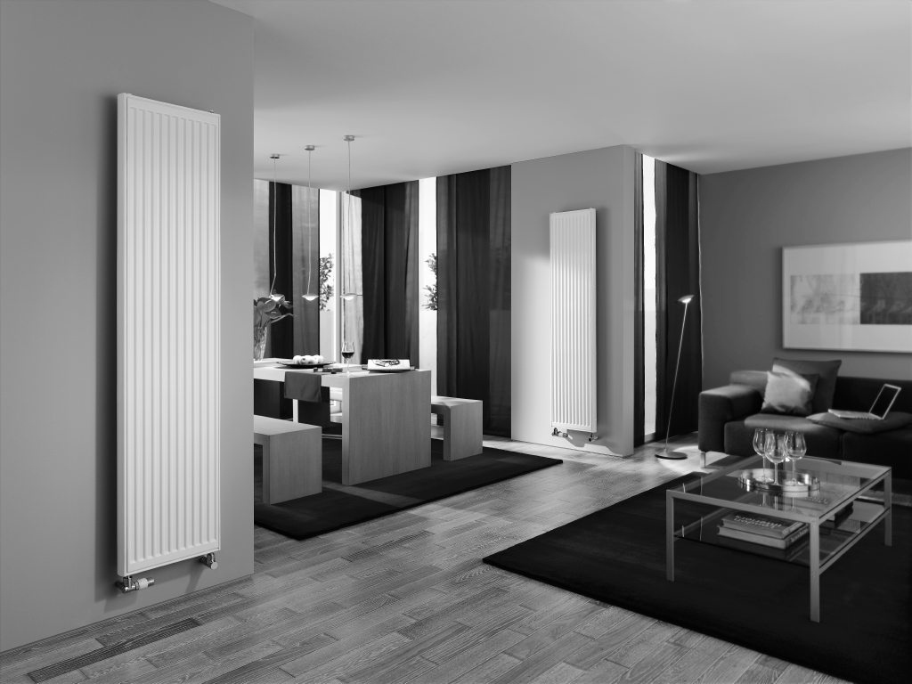 Smukły grzejnik płytowy pionowy profilowany Kermi Verteo Profil FSN, podłączenie dolne, środkowe lub po zewnętrznej, zasilanie z lewej strony, możliwość podłączenia grzejnika od góry, gwint wewn. 6 x 1/2”, obieg wody wymuszony, stalowy, produkowany wg normy PN EN 442, posiada znak CE, deklarację DWU. Wysoka moc grzewcza – odpowiednia do niskich temperatur zasilania, np. pompy ciepła. Dostarczany z: kompletem mocowań do ściany, odpowietrznikiem, kompletem osłon bocznych (górna na zamówienie) wykonanych z blachy ocynkowanej – łatwych do zdjęcia (w celu wyczyszczenia) bez ruszania zawiesi. Standardowo kolor biel Kermi zbliżony do RAL 9016. Za dopłatą możliwość zamówienia grzejnika w kolorze z palety Kermi lub RAL Classic i z dodatkową powłoką antykorozyjną. Lakierowanie dwuwarstwowe. Grzejnik odtłuszczony, fosforanowany, zagruntowany zanurzeniowo ETL i lakierowany proszkowo EPS. Ciśnienie robocze 10 bar, temp. max. 110oC Grzejnik standardowo wyposażony w opatentowany system Therm-x2: szeregowe połączenie płyt grzejnika (najpierw zasilana jest płyta przednia, a następnie tylne płyty), co pozwala skrócić o 25 % czas rozgrzewania pomieszczenia oraz zwiększyć do 100% emisję energii przez promieniowanie. Wszystkie te funkcje, w połączeniu z zaworem ustawionym na odpowiednią wartość kV,, przyczyniają się do zmniejszenia kosztów energii aż do 11%. Często wydajność przedniej płyty jest wystarczająca a kolejna płyta uzyskuje funkcję ekranu przeciw wypromieniowaniu ciepła. Kolejne płyty grzeją dopiero przy zwiększonym zapotrzebowaniu na ciepło.