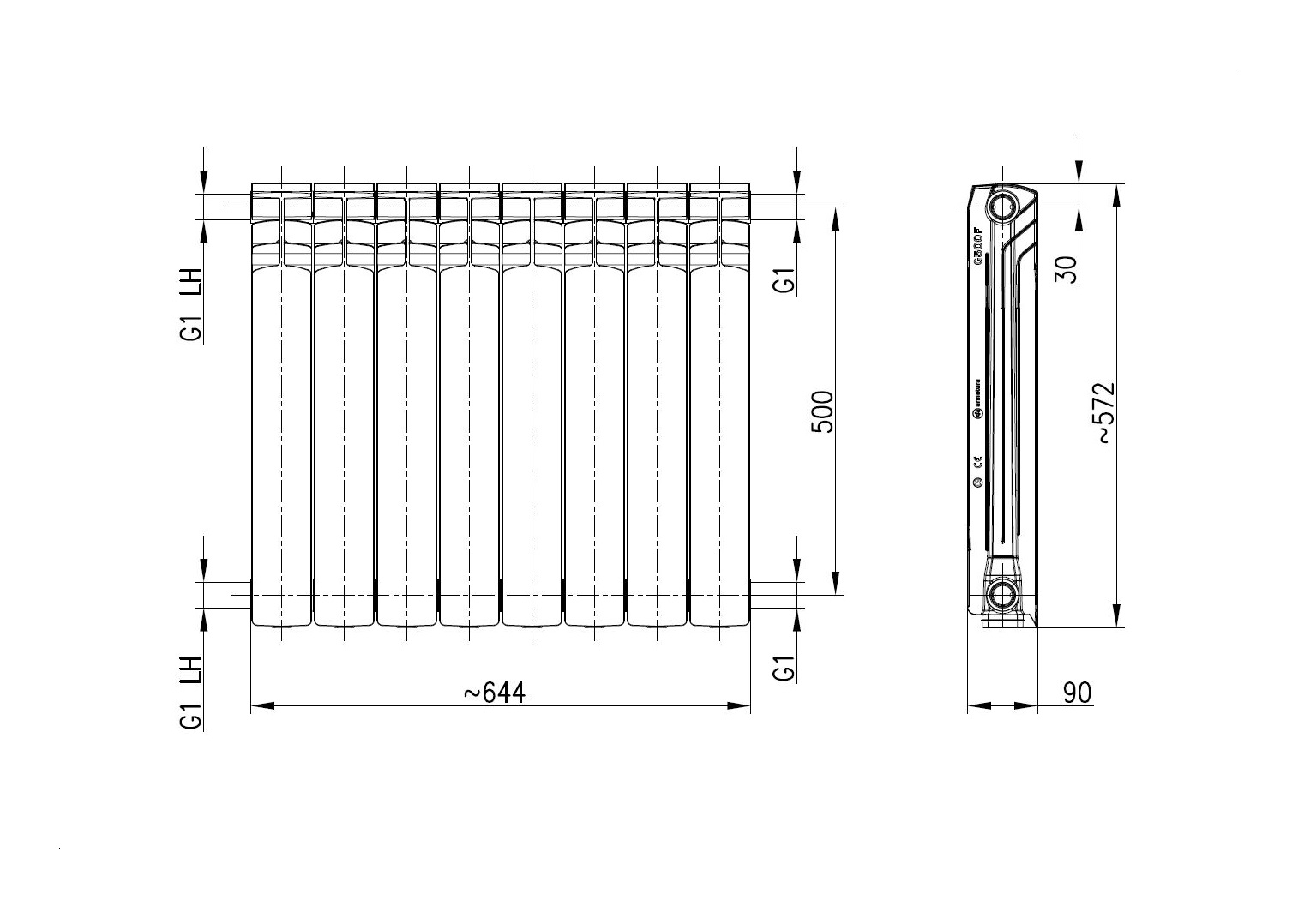 Grzejnik żeberkowy KFA Armatura G500/8 aluminium, podłączenie boczne 572 x 644 mm, kolor grafit (RAL 9007), moc 1128 W