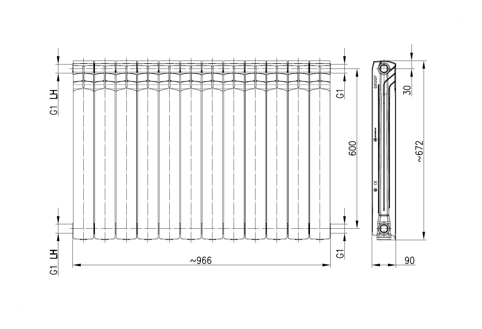 Grzejnik żeberkowy KFA Armatura G600F/12 aluminium, podłączenie boczne 672 x 966 mm, kolor grafit