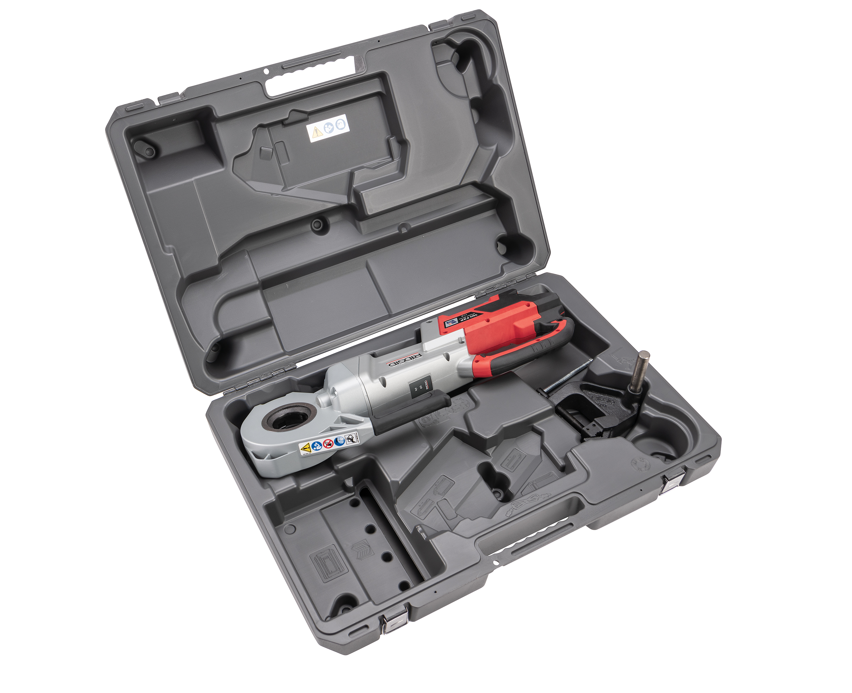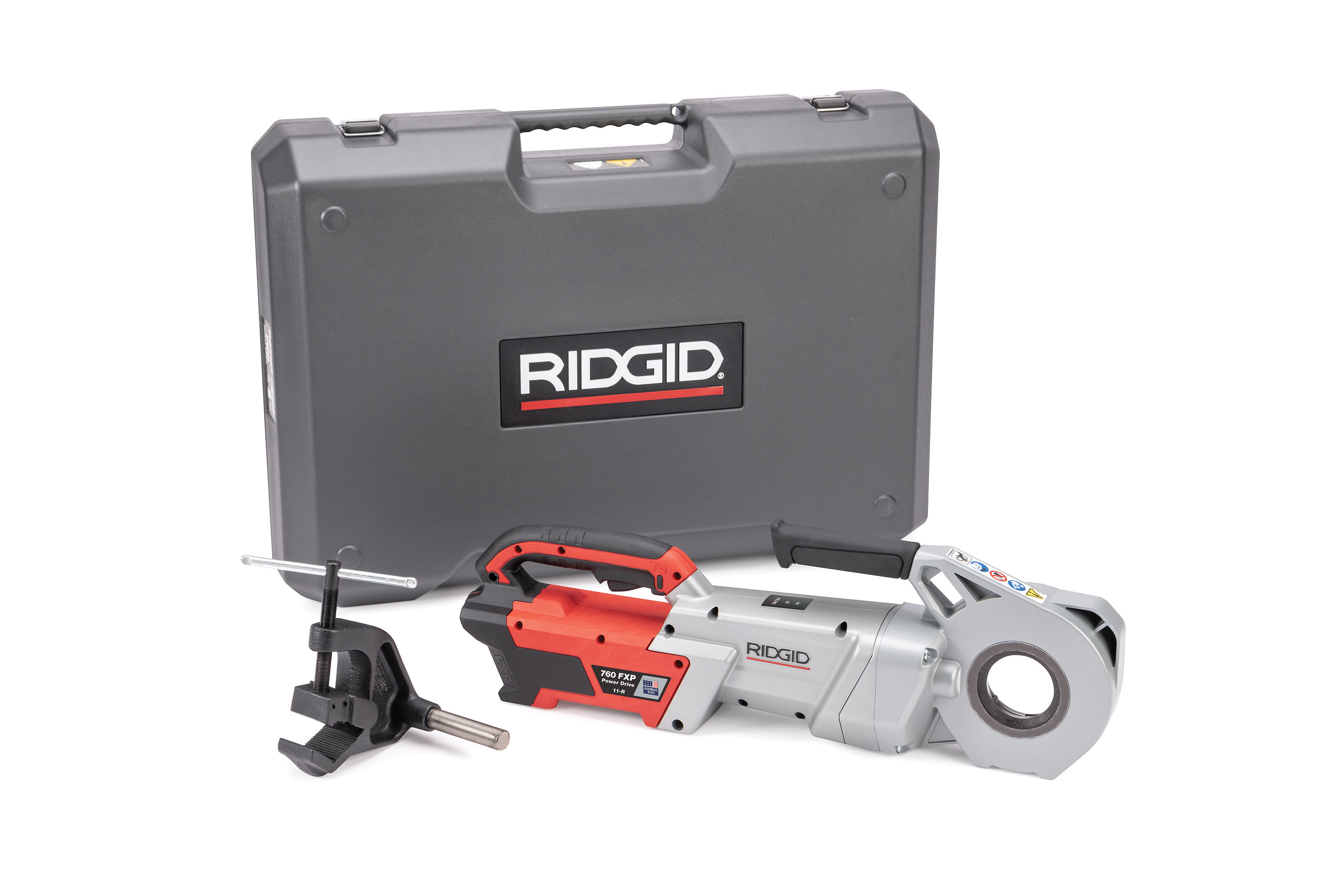 Gwintownica z napędem mechanicznym 760 FXP (11-R), 2 akumulatory FXP 4 Ah, ładowarka FXP (wtyczka EU i UK), zestaw głowicy gwinciarskiej 1/2-2" 11-R BSPT, ramię wsporcze, walizka