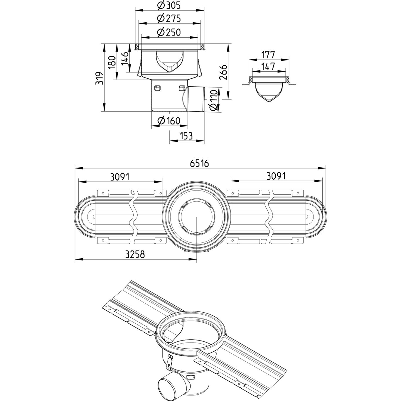 HYGIENICPRO Korpus kanału (do dokupienia syfon typ 562, kosz osadczy typ 780 oraz ruszt typ 697.250.150.50 ) wymiar 150x6000 C OUTLET odpływ na środku poziomy, niski model kosz osadczy 780.004.010.05