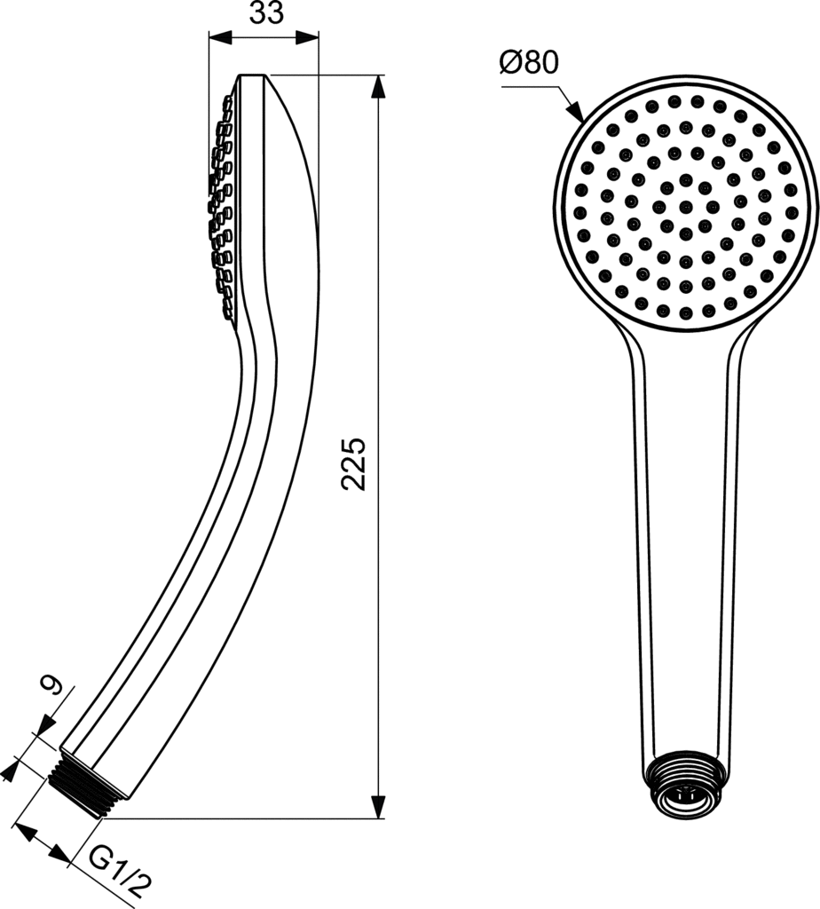 Słuchawka prysznicowa jednofunkcyjna. Gumowe końcówki dysz zapobiegające osadzaniu się kamienia. Ogranicznik przepływu wody do 8 l/min. Logo Ideal Standard, ręczna dźwignia prysznicowa.