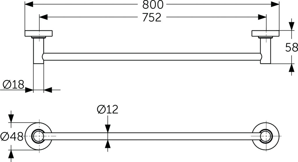 Uchwyt na ręcznik, 80 cm. Średnica rurki 12 mm. W komplecie z zestawem montażowym. Wymiary: 800 mm x 58 mm x 48 mm, 0,80 kg.