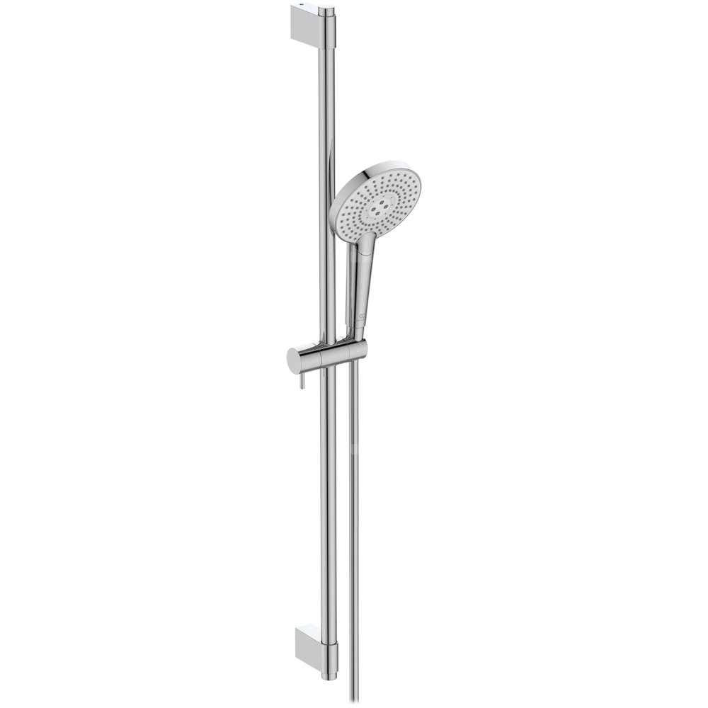 Metalowy drążek prysznicowy długości 900 mm. Regulowane metalowe mocowanie słuchawki. Wąż Idealflex 1750 mm z tworzywa odpornego na osad kamienia. Trzyfunkcyjna słuchawka średnicy Ø 125 mm. Rodzaje strumienia wody: deszcz, drop jet, masaż. Wybór strumienia wygodnym przyciskiem Navigo. Gumowe końcówki dysz zapobiegające osadzaniu się kamienia. Ogranicznik przepływu wody do 8 l/min. Minimalne ciśnienie wody 0,1 bar.