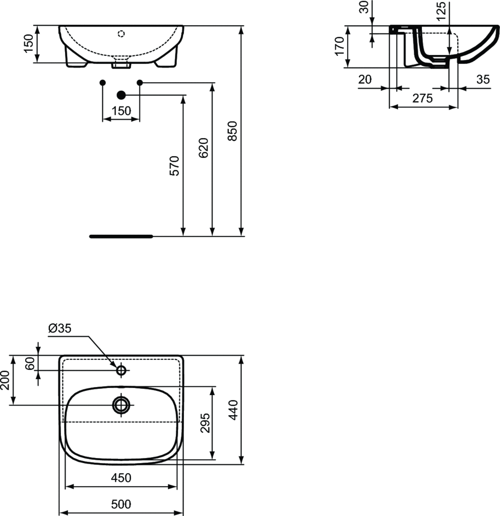 Szafka podumywalkowa Ideal Standard i.life A z wybitym centralnym otworem na baterię oraz zprzelewem. Zestaw montażowy E2091 i szablon do wycinania VV2401290525 w komplecie.